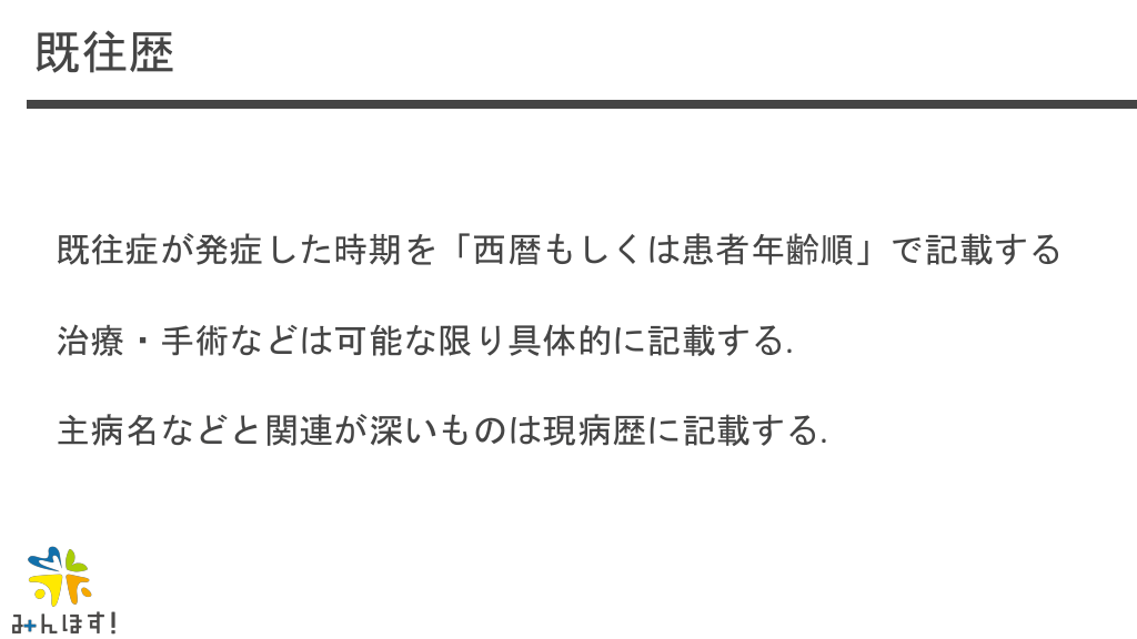 #24. 既往歴 既往症が発症した時期を「西暦もしくは患者年齢順」で記載する 治療・手術などは可能な限り具体的に記載する. 主病名などと関連が深いものは現病歴に記載する.