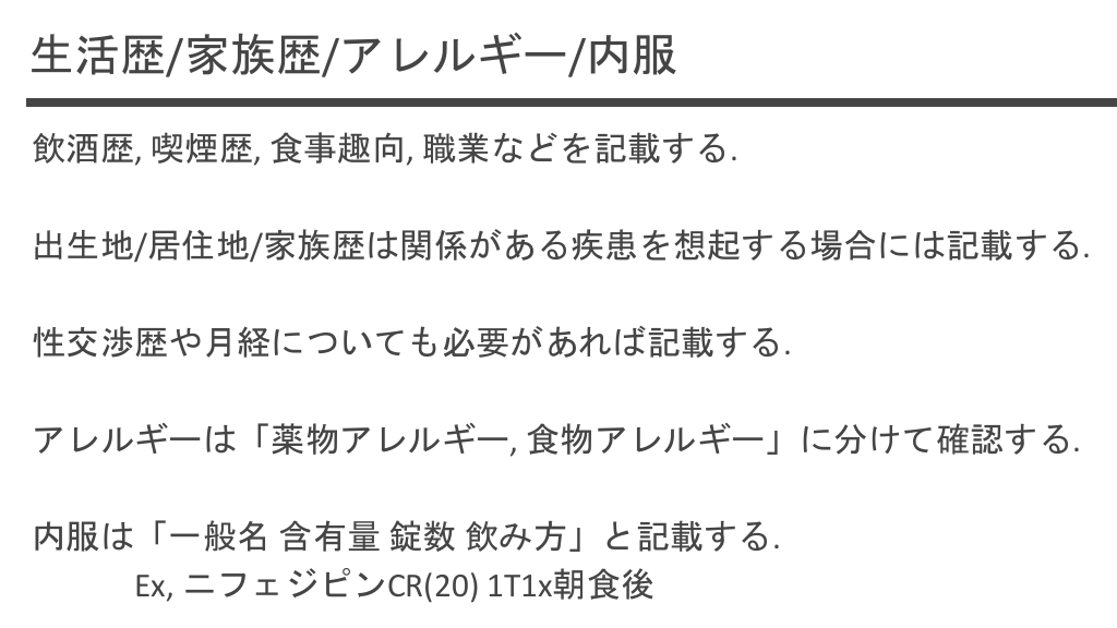 #25. 生活歴/家族歴/アレルギー/内服 飲酒歴, 喫煙歴, 食事趣向, 職業などを記載する. 出生地/居住地/家族歴は関係がある疾患を想起する場合には記載する. 性交渉歴や月経についても必要があれば記載する. アレルギーは「薬物アレルギー, 食物アレルギー」に分けて確認する. 内服は「一般名 含有量 錠数 飲み方」と記載する. Ex, ニフェジピンCR(20) 1T1x朝食後