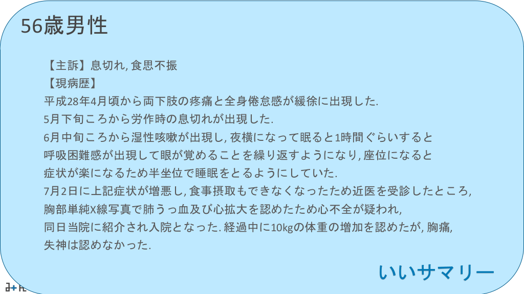 #27. 56歳男性 【主訴】息切れ, 食思不振 【現病歴】 平成28年4月頃から両下肢の疼痛と全身倦怠感が緩徐に出現した. 5月下旬ころから労作時の息切れが出現した. 6月中旬ころから湿性咳嗽が出現し, 夜横になって眠ると1時間ぐらいすると 呼吸困難感が出現して眼が覚めることを繰り返すようになり, 座位になると 症状が楽になるため半坐位で睡眠をとるようにしていた. 7月2日に上記症状が増悪し, 食事摂取もできなくなったため近医を受診したところ, 胸部単純X線写真で肺うっ血及び心拡大を認めたため心不全が疑われ, 同日当院に紹介され入院となった. 経過中に10kgの体重の増加を認めたが, 胸痛, 失神は認めなかった. いいサマリー