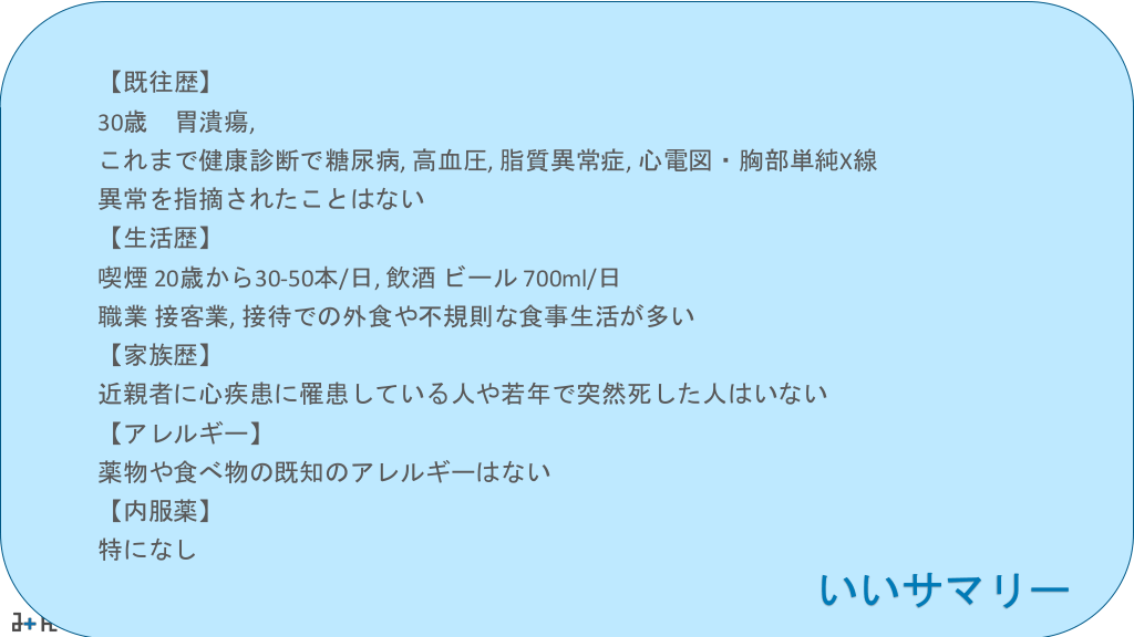 #28. 【既往歴】 30歳 胃潰瘍, これまで健康診断で糖尿病, 高血圧, 脂質異常症, 心電図・胸部単純X線 異常を指摘されたことはない 【生活歴】 喫煙 20歳から30-50本/日, 飲酒 ビール 700ml/日 職業 接客業, 接待での外食や不規則な食事生活が多い 【家族歴】 近親者に心疾患に罹患している人や若年で突然死した人はいない 【アレルギー】 薬物や食べ物の既知のアレルギーはない 【内服薬】 特になし いいサマリー
