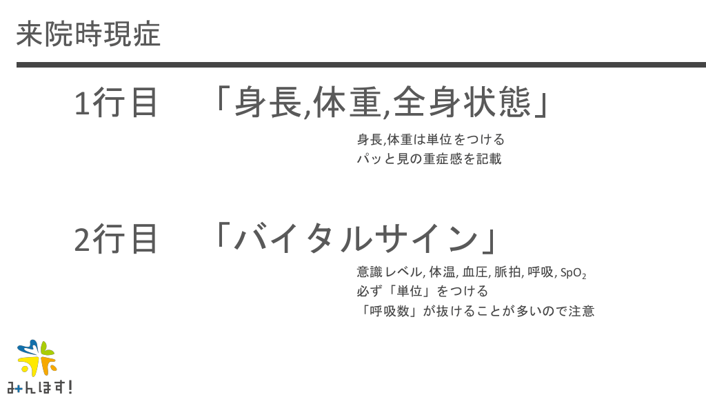 #29. 来院時現症 1行目 「身長,体重,全身状態」 身長,体重は単位をつける パッと見の重症感を記載 2行目 「バイタルサイン」 意識レベル, 体温, 血圧, 脈拍, 呼吸, SpO2 必ず「単位」をつける 「呼吸数」が抜けることが多いので注意