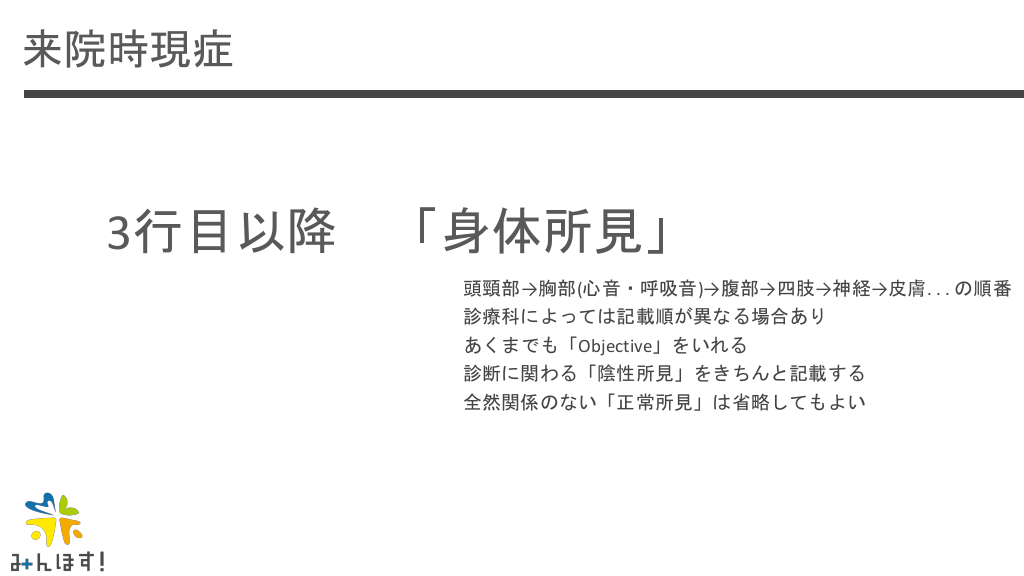 #30. 来院時現症 3行目以降 「身体所見」 頭頸部→胸部(心音・呼吸音)→腹部→四肢→神経→皮膚. . . の順番 診療科によっては記載順が異なる場合あり あくまでも「Objective」をいれる 診断に関わる「陰性所見」をきちんと記載する 全然関係のない「正常所見」は省略してもよい