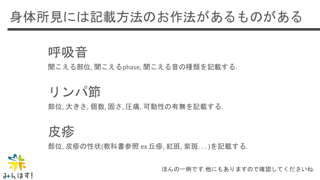 #31. 身体所見には記載方法のお作法があるものがある 呼吸音 聞こえる部位, 聞こえるphase, 聞こえる音の種類を記載する. リンパ節 部位, 大きさ, 個数, 固さ, 圧痛, 可動性の有無を記載する. 皮疹 部位, 皮疹の性状(教科書参照 ex 丘疹, 紅班, 紫斑. . . )を記載する. ほんの一例です.他にもありますので確認してくださいね.