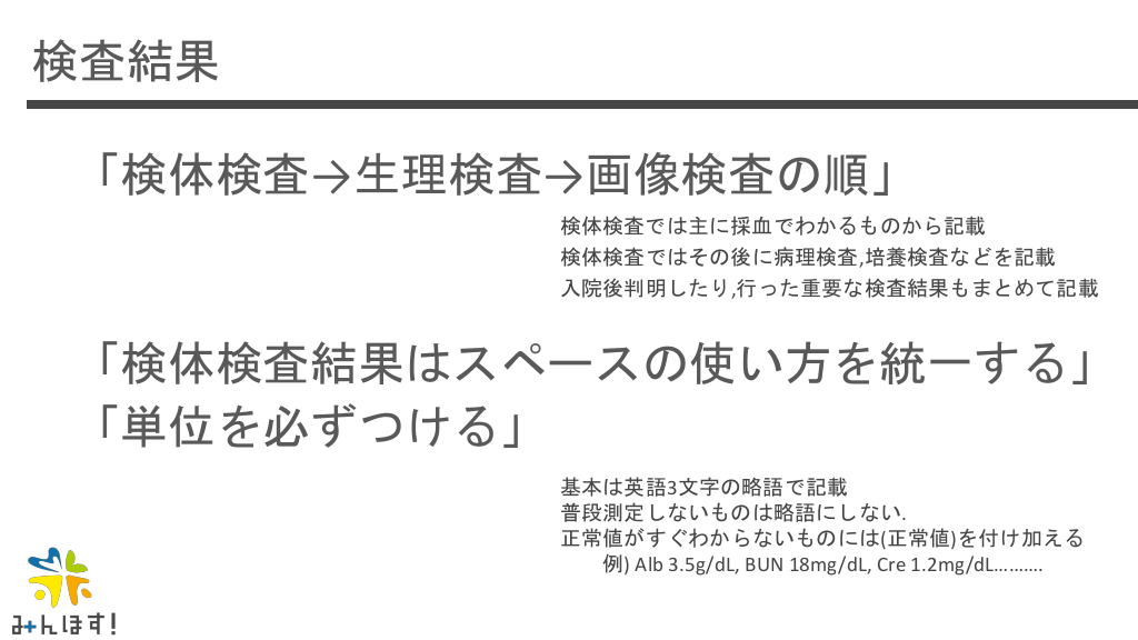 #32. 検査結果 「検体検査→生理検査→画像検査の順」 検体検査では主に採血でわかるものから記載 検体検査ではその後に病理検査,培養検査などを記載 入院後判明したり,行った重要な検査結果もまとめて記載 「検体検査結果はスペースの使い方を統一する」 「単位を必ずつける」 基本は英語3文字の略語で記載 普段測定しないものは略語にしない. 正常値がすぐわからないものには(正常値)を付け加える 例) Alb 3.5g/dL, BUN 18mg/dL, Cre 1.2mg/dL……….