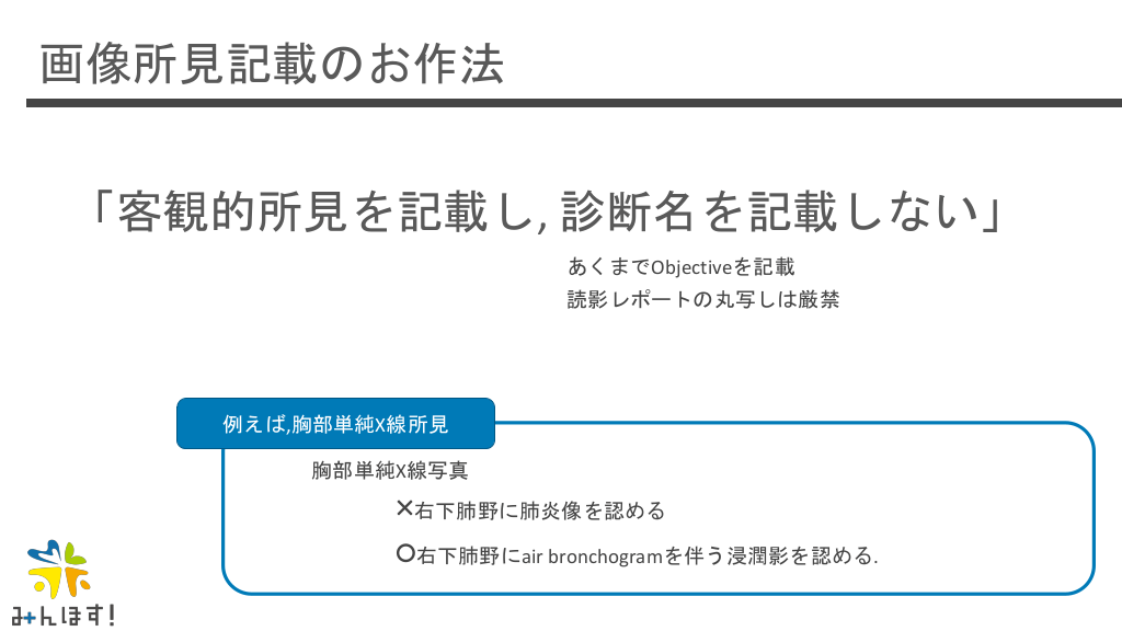 #33. 画像所見記載のお作法 「客観的所見を記載し, 診断名を記載しない」 あくまでObjectiveを記載 読影レポートの丸写しは厳禁 例えば,胸部単純X線所見 胸部単純X線写真 ×右下肺野に肺炎像を認める ○右下肺野にair bronchogramを伴う浸潤影を認める.
