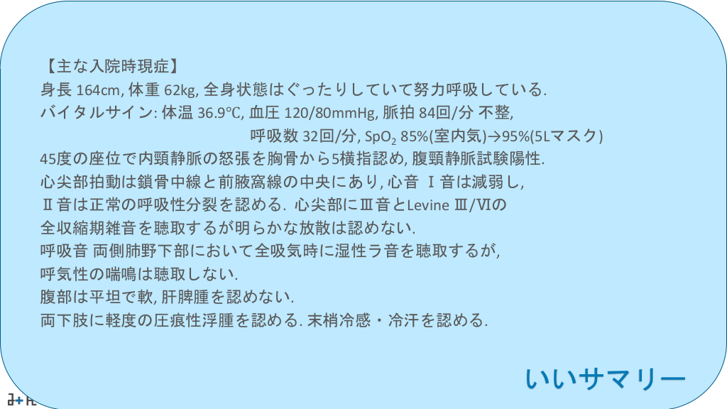 #35. 【主な入院時現症】 身長 164cm, 体重 62kg, 全身状態はぐったりしていて努力呼吸している. バイタルサイン: 体温 36.9℃, 血圧 120/80mmHg, 脈拍 84回/分 不整, 呼吸数 32回/分, SpO2 85%(室内気)→95%(5Lマスク) 45度の座位で内頸静脈の怒張を胸骨から5横指認め, 腹頸静脈試験陽性. 心尖部拍動は鎖骨中線と前腋窩線の中央にあり, 心音 Ⅰ音は減弱し, Ⅱ音は正常の呼吸性分裂を認める. 心尖部にⅢ音とLevine Ⅲ/Ⅵの 全収縮期雑音を聴取するが明らかな放散は認めない. 呼吸音 両側肺野下部において全吸気時に湿性ラ音を聴取するが, 呼気性の喘鳴は聴取しない. 腹部は平坦で軟, 肝脾腫を認めない. 両下肢に軽度の圧痕性浮腫を認める. 末梢冷感・冷汗を認める. いいサマリー
