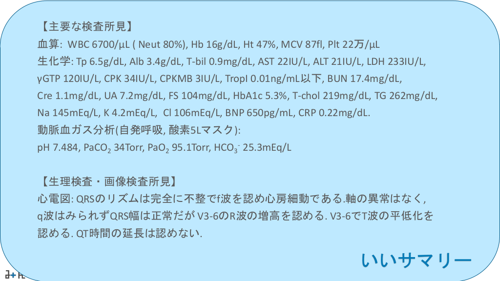 #36. 【主要な検査所見】 血算: WBC 6700/μL ( Neut 80%), Hb 16g/dL, Ht 47%, MCV 87fl, Plt 22万/μL 生化学: Tp 6.5g/dL, Alb 3.4g/dL, T-bil 0.9mg/dL, AST 22IU/L, ALT 21IU/L, LDH 233IU/L, γGTP 120IU/L, CPK 34IU/L, CPKMB 3IU/L, TropI 0.01ng/mL以下, BUN 17.4mg/dL, Cre 1.1mg/dL, UA 7.2mg/dL, FS 104mg/dL, HbA1c 5.3%, T-chol 219mg/dL, TG 262mg/dL, Na 145mEq/L, K 4.2mEq/L, Cl 106mEq/L, BNP 650pg/mL, CRP 0.22mg/dL. 動脈血ガス分析(自発呼吸, 酸素5Lマスク): pH 7.484, PaCO2 34Torr, PaO2 95.1Torr, HCO3- 25.3mEq/L 【生理検査・画像検査所見】 心電図: QRSのリズムは完全に不整でf波を認め心房細動である.軸の異常はなく, q波はみられずQRS幅は正常だが V3-6のR波の増高を認める. V3-6でT波の平低化を 認める. QT時間の延長は認めない. いいサマリー