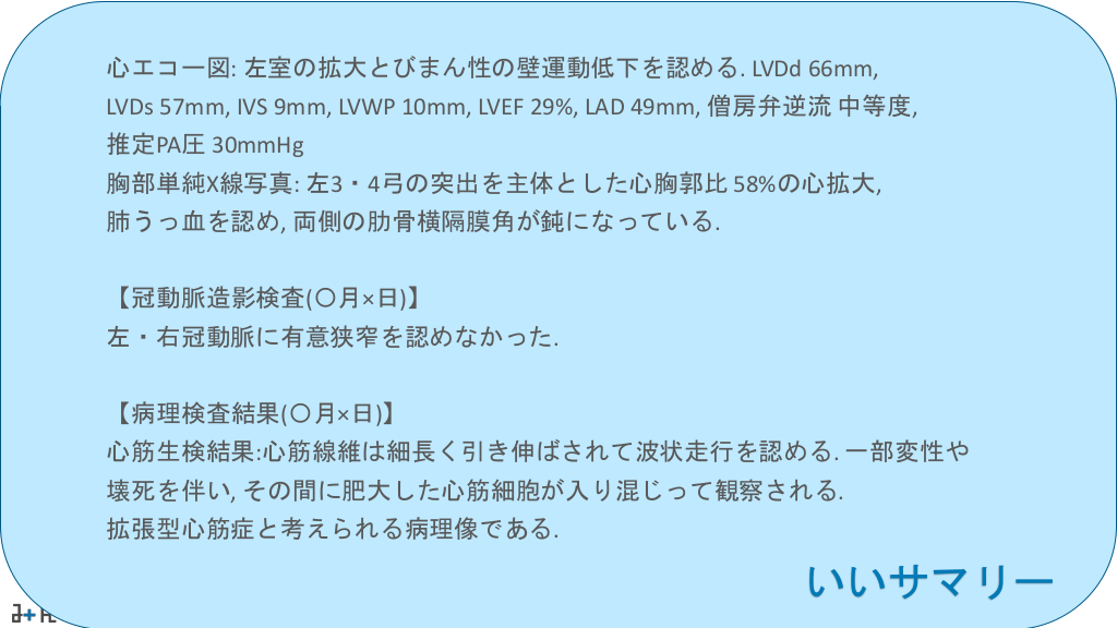 #37. 心エコー図: 左室の拡大とびまん性の壁運動低下を認める. LVDd 66mm, LVDs 57mm, IVS 9mm, LVWP 10mm, LVEF 29%, LAD 49mm, 僧房弁逆流 中等度, 推定PA圧 30mmHg 胸部単純X線写真: 左3・4弓の突出を主体とした心胸郭比 58%の心拡大, 肺うっ血を認め, 両側の肋骨横隔膜角が鈍になっている. 【冠動脈造影検査(〇月×日)】 左・右冠動脈に有意狭窄を認めなかった. 【病理検査結果(〇月×日)】 心筋生検結果:心筋線維は細長く引き伸ばされて波状走行を認める. 一部変性や 壊死を伴い, その間に肥大した心筋細胞が入り混じって観察される. 拡張型心筋症と考えられる病理像である. いいサマリー