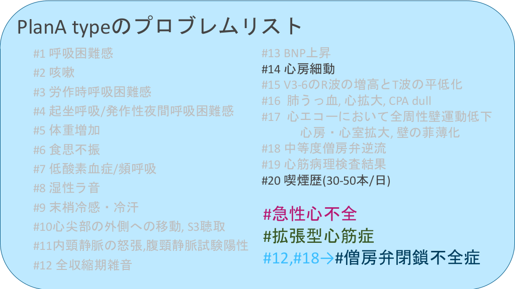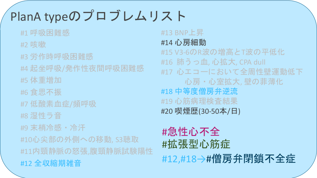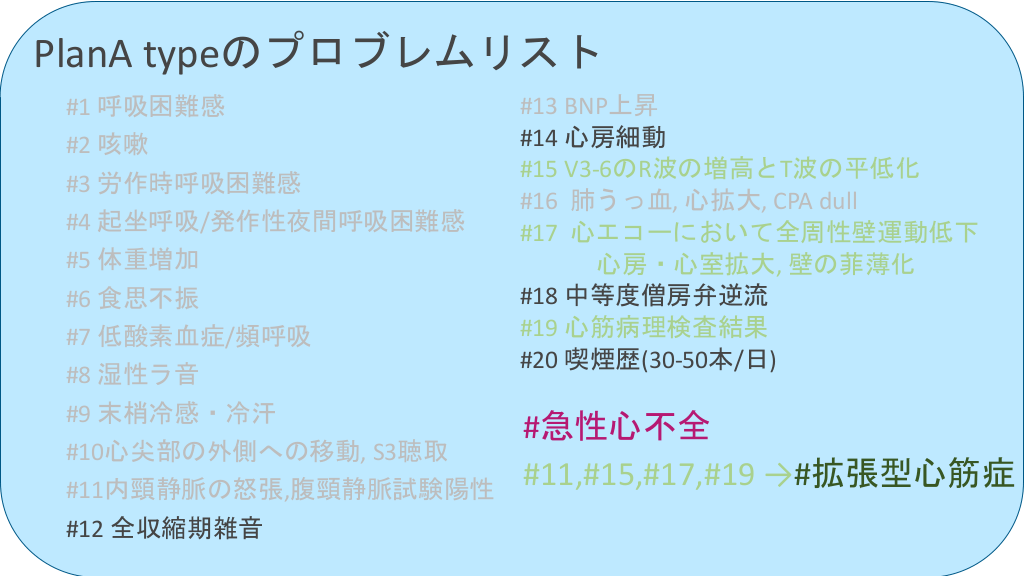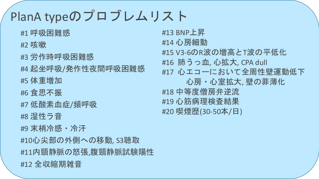 #39. PlanA typeのプロブレムリスト #1 呼吸困難感 #2 咳嗽 #3 労作時呼吸困難感 #4 起坐呼吸/発作性夜間呼吸困難感 #5 体重増加 #6 食思不振 #7 低酸素血症/頻呼吸 #8 湿性ラ音 #9 末梢冷感・冷汗 #10心尖部の外側への移動, S3聴取 #11内頸静脈の怒張,腹頸静脈試験陽性 #12 全収縮期雑音 #13 BNP上昇 #14 心房細動 #15 V3-6のR波の増高とT波の平低化 #16 肺うっ血, 心拡大, CPA dull #17 心エコーにおいて全周性壁運動低下 心房・心室拡大, 壁の菲薄化 #18 中等度僧房弁逆流 #19 心筋病理検査結果 #20 喫煙歴(30-50本/日)