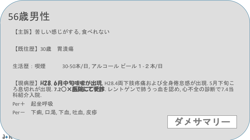 #4. 56歳男性 【主訴】苦しい感じがする, 食べれない 【既往歴】30歳 胃潰瘍 生活歴:喫煙 30-50本/日, アルコール ビール1-2本/日 【現病歴】H28. 6月中旬咳嗽が出現, H28.4両下肢疼痛および全身倦怠感が出現. 5月下旬こ ろ息切れが出現. 7.2○×医院にて受診. レントゲンで肺うっ血を認め, 心不全の診断で7.4当 科紹介入院. Per+ 起坐呼吸 Per- 下痢, 口渇, 下血, 吐血, 皮疹 ダメサマリー