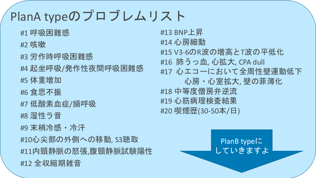#40. PlanA typeのプロブレムリスト #1 呼吸困難感 #2 咳嗽 #3 労作時呼吸困難感 #4 起坐呼吸/発作性夜間呼吸困難感 #5 体重増加 #6 食思不振 #7 低酸素血症/頻呼吸 #8 湿性ラ音 #9 末梢冷感・冷汗 #10心尖部の外側への移動, S3聴取 #11内頸静脈の怒張,腹頸静脈試験陽性 #12 全収縮期雑音 #13 BNP上昇 #14 心房細動 #15 V3-6のR波の増高とT波の平低化 #16 肺うっ血, 心拡大, CPA dull #17 心エコーにおいて全周性壁運動低下 心房・心室拡大, 壁の菲薄化 #18 中等度僧房弁逆流 #19 心筋病理検査結果 #20 喫煙歴(30-50本/日) PlanB typeに していきますよ