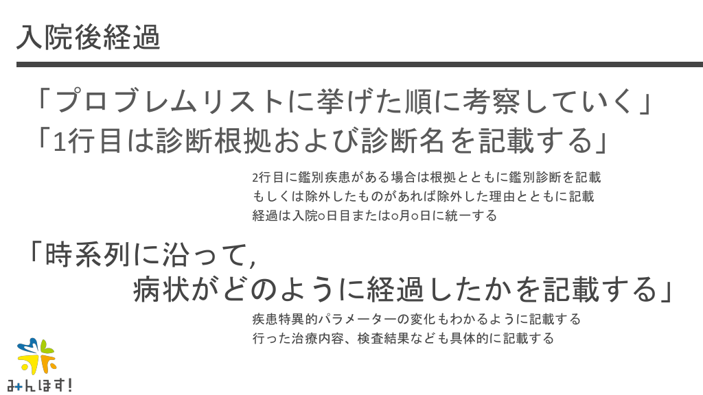 #46. 入院後経過 「プロブレムリストに挙げた順に考察していく」 「1行目は診断根拠および診断名を記載する」 2行目に鑑別疾患がある場合は根拠とともに鑑別診断を記載 もしくは除外したものがあれば除外した理由とともに記載 経過は入院○日目または○月○日に統一する 「時系列に沿って, 病状がどのように経過したかを記載する」 疾患特異的パラメーターの変化もわかるように記載する 行った治療内容、検査結果なども具体的に記載する