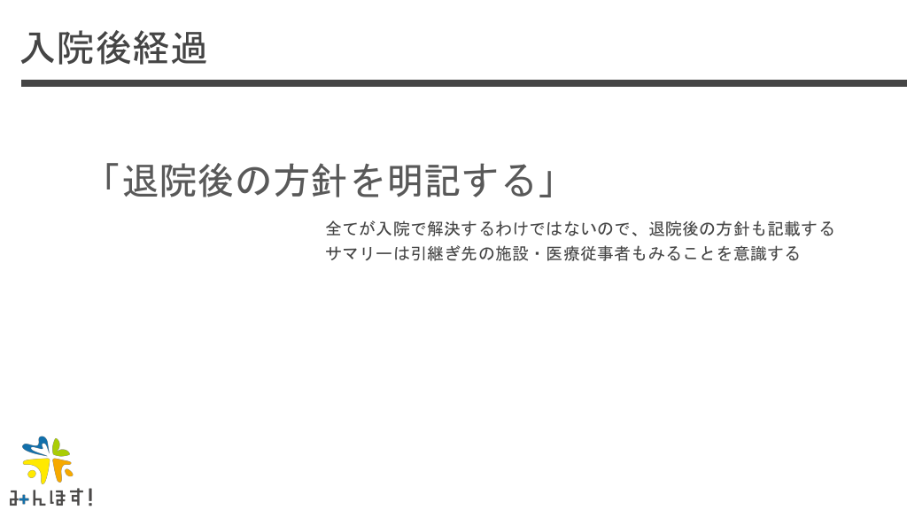 #47. 入院後経過 「退院後の方針を明記する」 全てが入院で解決するわけではないので、退院後の方針も記載する サマリーは引継ぎ先の施設・医療従事者もみることを意識する