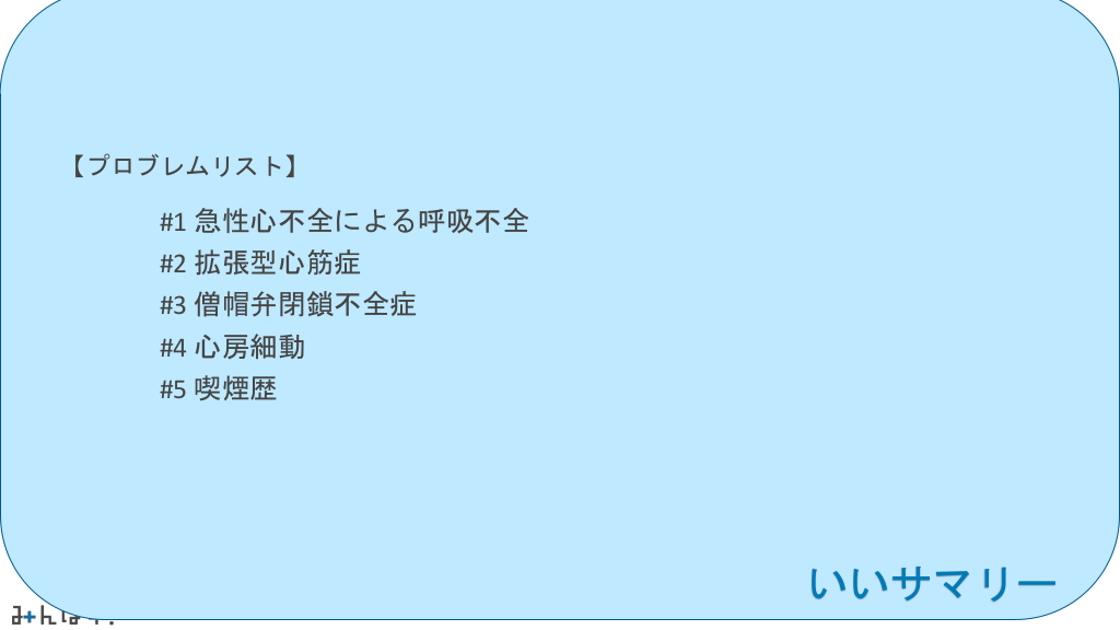 #49. 【プロブレムリスト】 #1 急性心不全による呼吸不全 #2 拡張型心筋症 #3 僧帽弁閉鎖不全症 #4 心房細動 #5 喫煙歴 いいサマリー