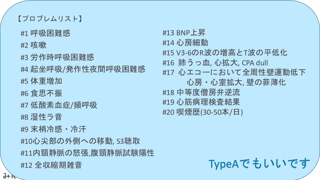 #50. 【プロブレムリスト】 #1 呼吸困難感 #2 咳嗽 #3 労作時呼吸困難感 #4 起坐呼吸/発作性夜間呼吸困難感 #5 体重増加 #6 食思不振 #7 低酸素血症/頻呼吸 #8 湿性ラ音 #9 末梢冷感・冷汗 #10心尖部の外側への移動, S3聴取 #11内頸静脈の怒張,腹頸静脈試験陽性 #12 全収縮期雑音 #13 BNP上昇 #14 心房細動 #15 V3-6のR波の増高とT波の平低化 #16 肺うっ血, 心拡大, CPA dull #17 心エコーにおいて全周性壁運動低下 心房・心室拡大, 壁の菲薄化 #18 中等度僧房弁逆流 #19 心筋病理検査結果 #20 喫煙歴(30-50本/日) TypeAでもいいです