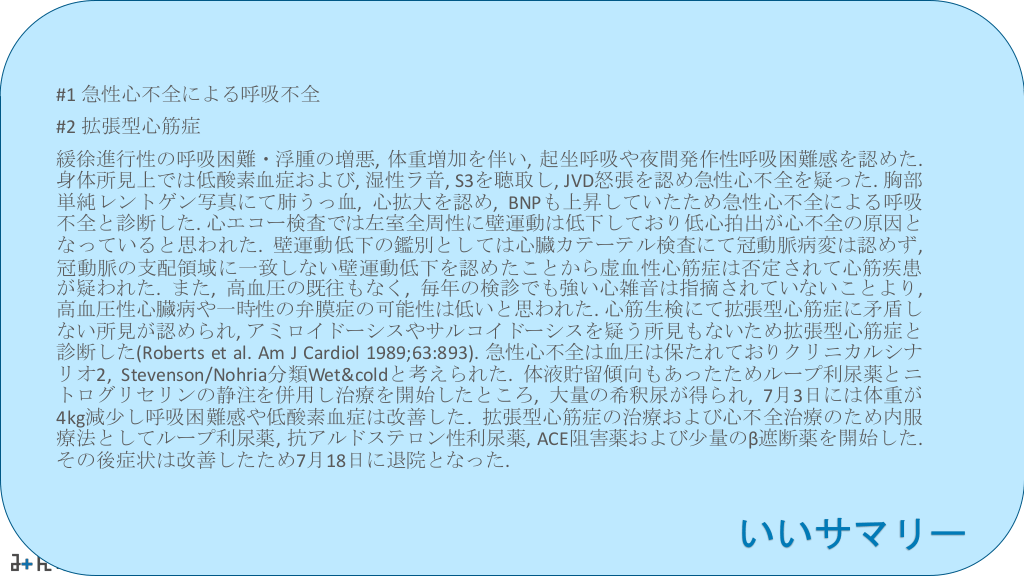 #51. #1 急性心不全による呼吸不全 #2 拡張型心筋症 緩徐進行性の呼吸困難・浮腫の増悪, 体重増加を伴い, 起坐呼吸や夜間発作性呼吸困難感を認めた. 身体所見上では低酸素血症および, 湿性ラ音, S3を聴取し, JVD怒張を認め急性心不全を疑った. 胸部 単純レントゲン写真にて肺うっ血, 心拡大を認め, BNPも上昇していたため急性心不全による呼吸 不全と診断した. 心エコー検査では左室全周性に壁運動は低下しており低心拍出が心不全の原因と なっていると思われた. 壁運動低下の鑑別としては心臓カテーテル検査にて冠動脈病変は認めず, 冠動脈の支配領域に一致しない壁運動低下を認めたことから虚血性心筋症は否定されて心筋疾患 が疑われた. また, 高血圧の既往もなく, 毎年の検診でも強い心雑音は指摘されていないことより, 高血圧性心臓病や一時性の弁膜症の可能性は低いと思われた. 心筋生検にて拡張型心筋症に矛盾し ない所見が認められ, アミロイドーシスやサルコイドーシスを疑う所見もないため拡張型心筋症と 診断した(Roberts et al. Am J Cardiol 1989;63:893). 急性心不全は血圧は保たれておりクリニカルシナ リオ2, Stevenson/Nohria分類Wet&coldと考えられた. 体液貯留傾向もあったためループ利尿薬とニ トログリセリンの静注を併用し治療を開始したところ, 大量の希釈尿が得られ, 7月3日には体重が 4kg減少し呼吸困難感や低酸素血症は改善した. 拡張型心筋症の治療および心不全治療のため内服 療法としてループ利尿薬, 抗アルドステロン性利尿薬, ACE阻害薬および少量のβ遮断薬を開始した. その後症状は改善したため7月18日に退院となった. いいサマリー