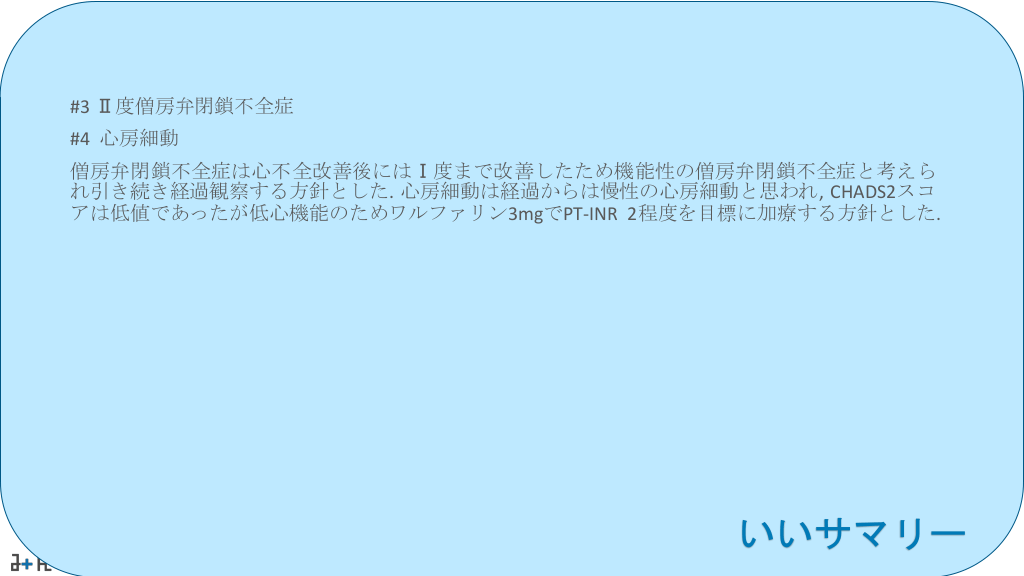 #52. #3 Ⅱ度僧房弁閉鎖不全症 #4 心房細動 僧房弁閉鎖不全症は心不全改善後にはⅠ度まで改善したため機能性の僧房弁閉鎖不全症と考えら れ引き続き経過観察する方針とした. 心房細動は経過からは慢性の心房細動と思われ, CHADS2スコ アは低値であったが低心機能のためワルファリン3mgでPT-INR 2程度を目標に加療する方針とした. いいサマリー