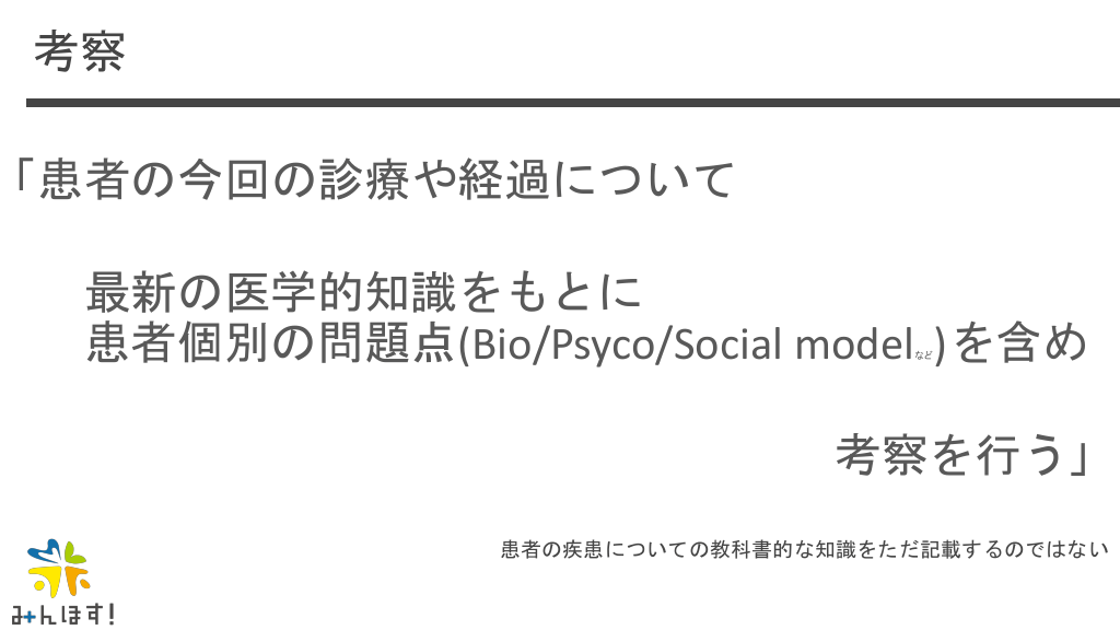 #53. 考察 「患者の今回の診療や経過について 最新の医学的知識をもとに 患者個別の問題点(Bio/Psyco/Social model ) を含め など 考察を行う」 患者の疾患についての教科書的な知識をただ記載するのではない
