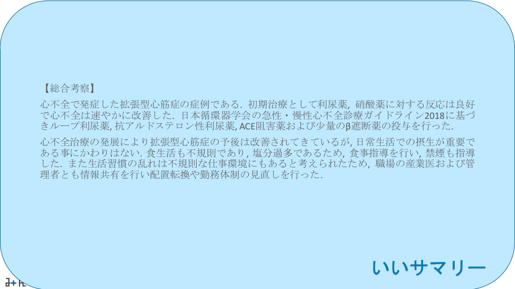 #54. 【総合考察】 心不全で発症した拡張型心筋症の症例である. 初期治療として利尿薬, 硝酸薬に対する反応は良好 で心不全は速やかに改善した. 日本循環器学会の急性・慢性心不全診療ガイドライン2018に基づ きループ利尿薬, 抗アルドステロン性利尿薬, ACE阻害薬および少量のβ遮断薬の投与を行った. 心不全治療の発展により拡張型心筋症の予後は改善されてきているが, 日常生活での摂生が重要で ある事にかわりはない. 食生活も不規則であり, 塩分過多であるため, 食事指導を行い, 禁煙も指導 した. また生活習慣の乱れは不規則な仕事環境にもあると考えられたため, 職場の産業医および管 理者とも情報共有を行い配置転換や勤務体制の見直しを行った. いいサマリー