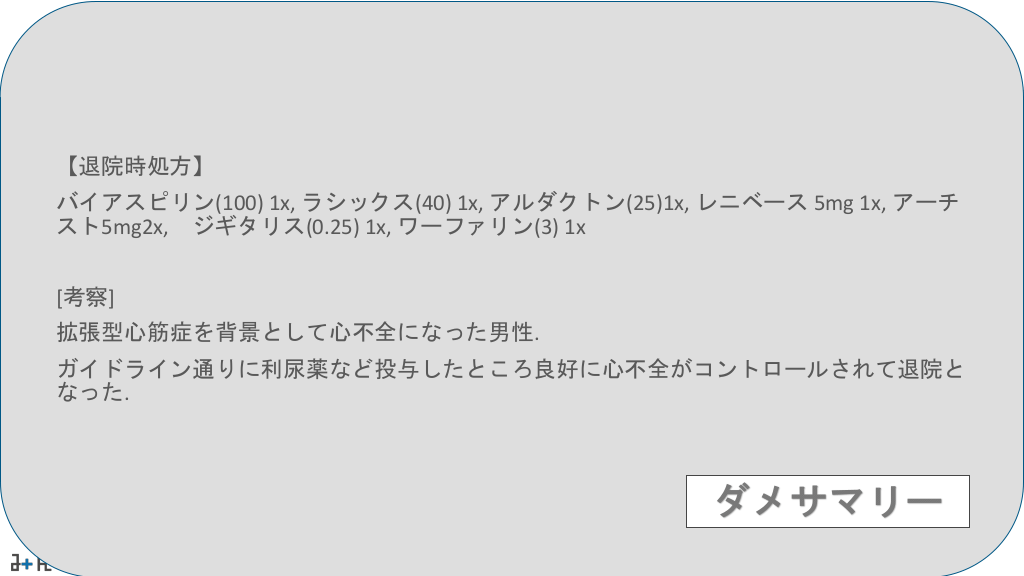 #7. 【退院時処方】 バイアスピリン(100) 1x, ラシックス(40) 1x, アルダクトン(25)1x, レニベース 5mg 1x, アーチ スト5mg2x, ジギタリス(0.25) 1x, ワーファリン(3) 1x [考察] 拡張型心筋症を背景として心不全になった男性. ガイドライン通りに利尿薬など投与したところ良好に心不全がコントロールされて退院と なった. ダメサマリー