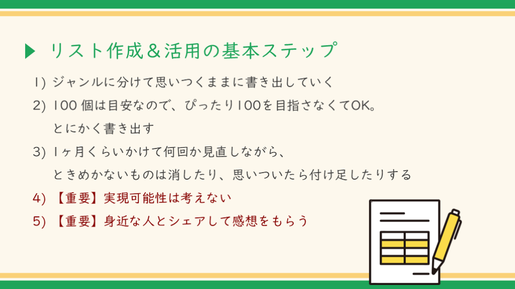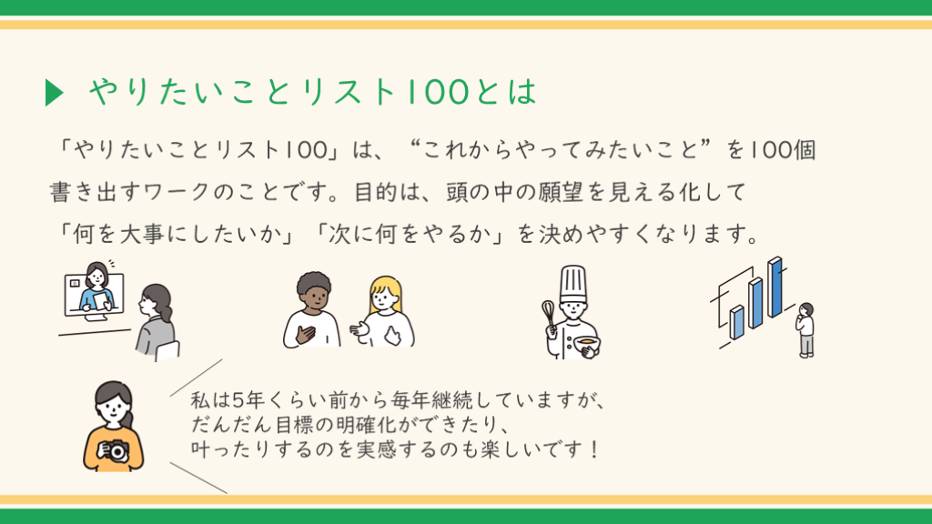#4. やりたいことリスト100とは 「やりたいことリスト100」は、“これからやってみたいこと”を100個書き出すワークのことです。目的は、頭の中の願望を見える化して