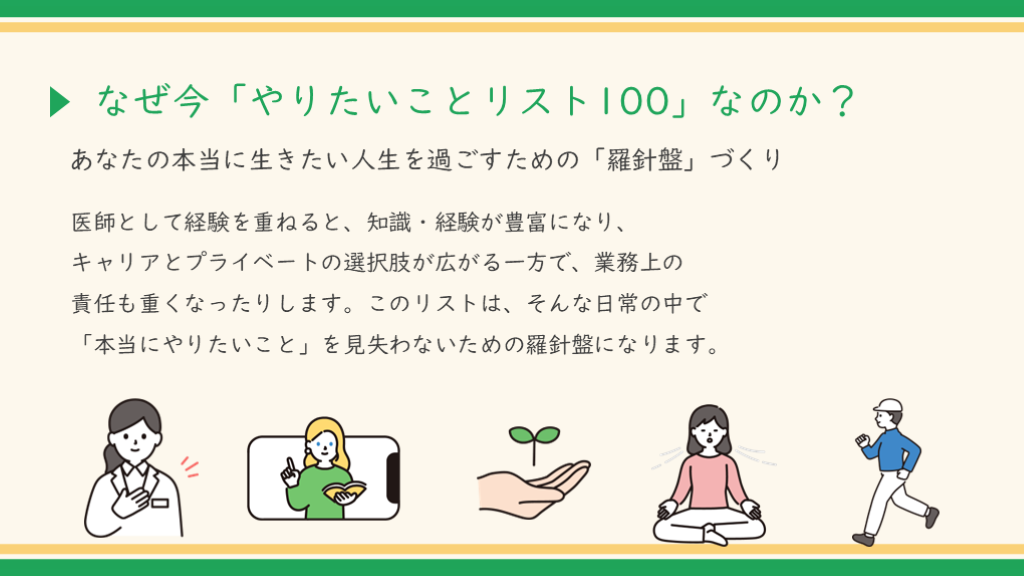 #5. なぜ今「やりたいことリスト100」なのか? あなたの本当に生きたい人生を過ごすための「羅針盤」づくり 医師として経験を重ねると、知識・経験が豊富になり、キャリアとプライベートの選択肢が広がる一方で、業務上の