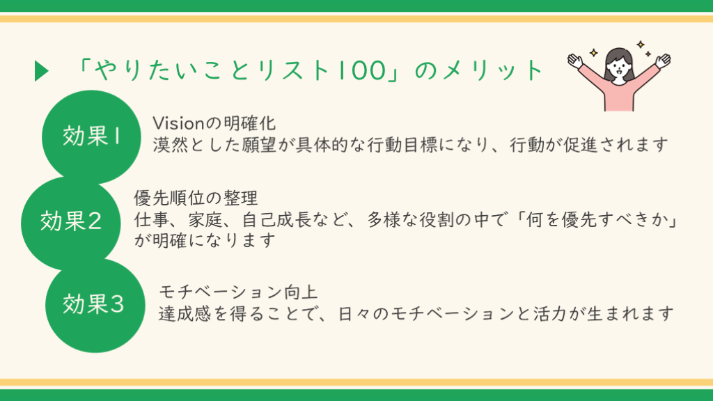 #6. 「やりたいことリスト100」のメリット 効果1 効果2 効果3 Visionの明確化