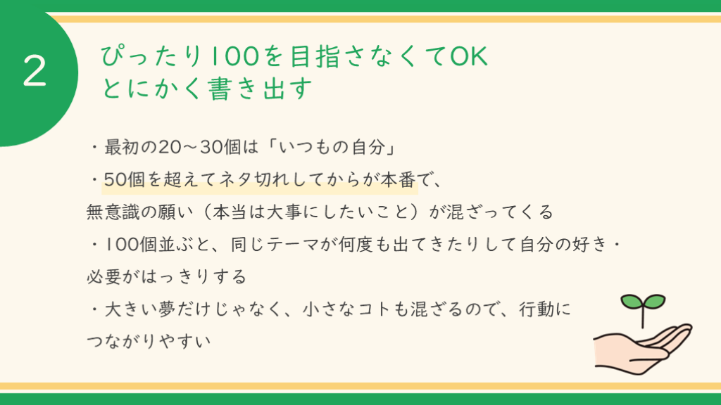 #9. ぴったり100を目指さなくてOKとにかく書き出す 2 ・最初の20~30個は「いつもの自分」