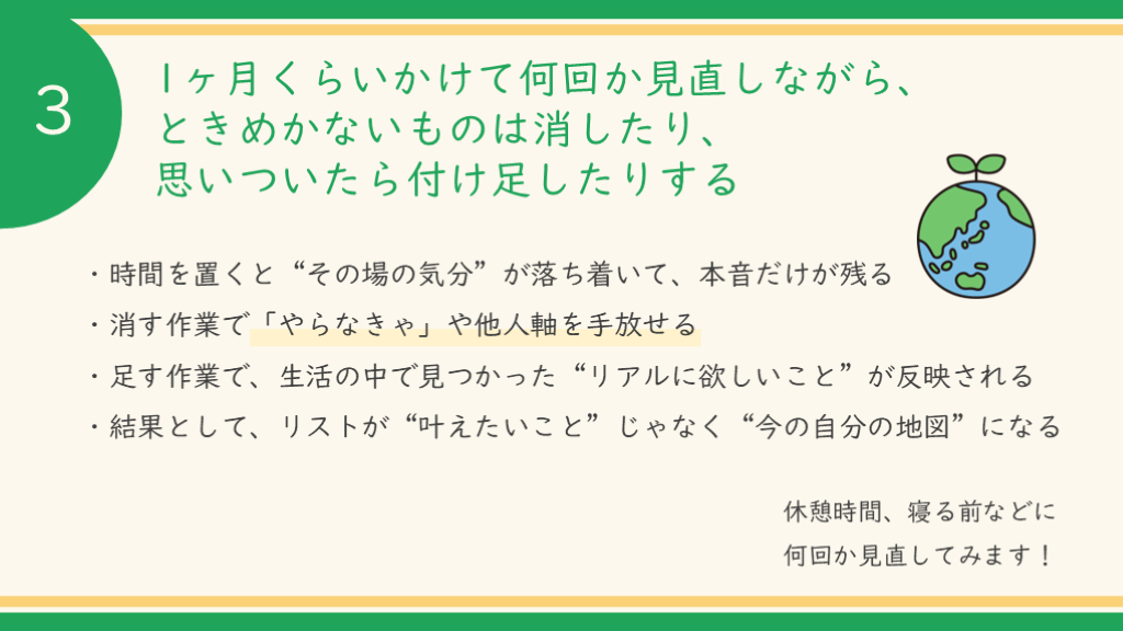 ・結果として、リストが“叶えたいこと”じゃなく“今の自分の地図”になる 1ヶ月くらいかけて何回か見直しながら、ときめかないものは消したり、