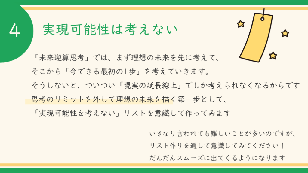 「実現可能性を考えない」リストを意識して作ってみます 実現可能性は考えない 4 いきなり言われても難しいことが多いのですが、