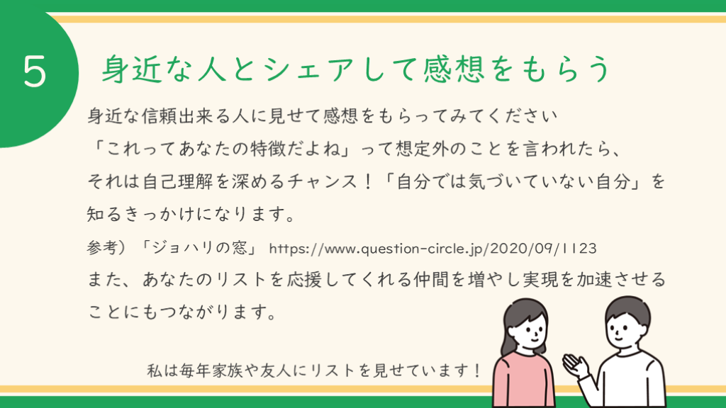 ことにもつながります。 身近な人とシェアして感想をもらう 5 私は毎年家族や友人にリストを見せています!