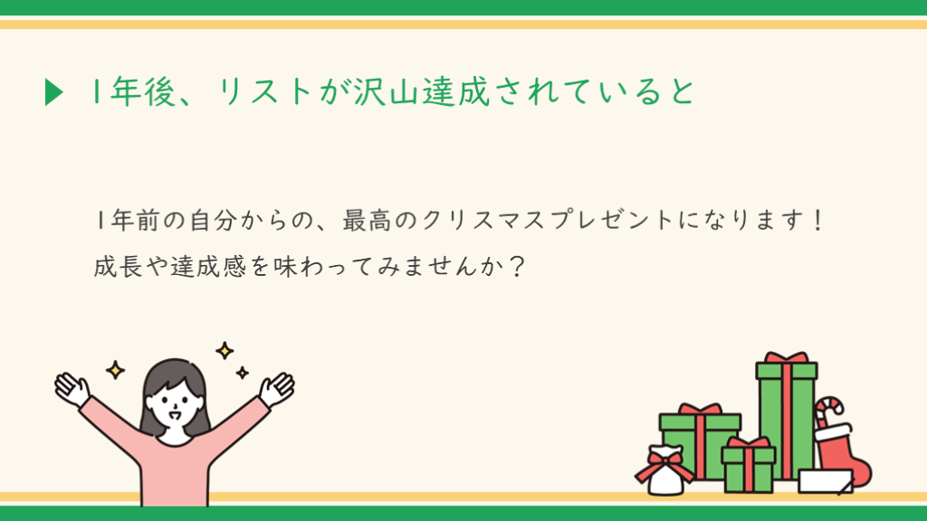 #16. 1年後、リストが沢山達成されていると 1年前の自分からの、最高のクリスマスプレゼントになります!