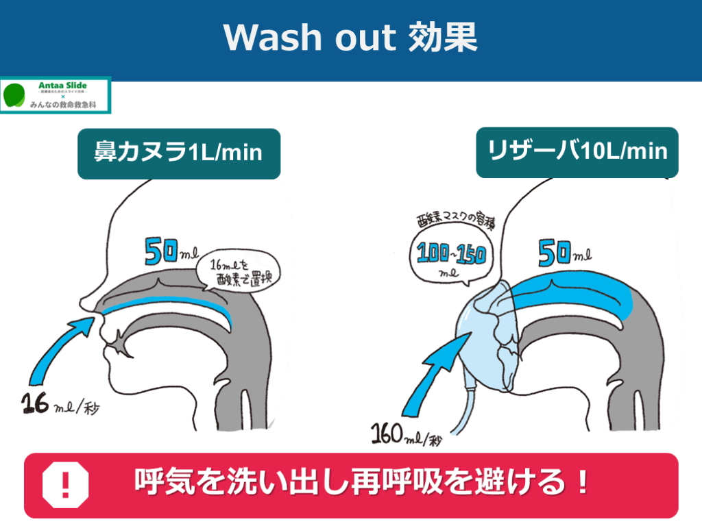 #14. Wash out 効果 鼻カヌラ1L/min リザーバ10L/min 呼気を洗い出し再呼吸を避ける!