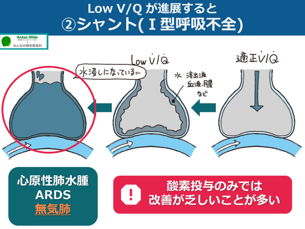 #22. Low V/Q と シャント を区別する理由 (完全に肺胞が虚脱してしまっている)シャント部分