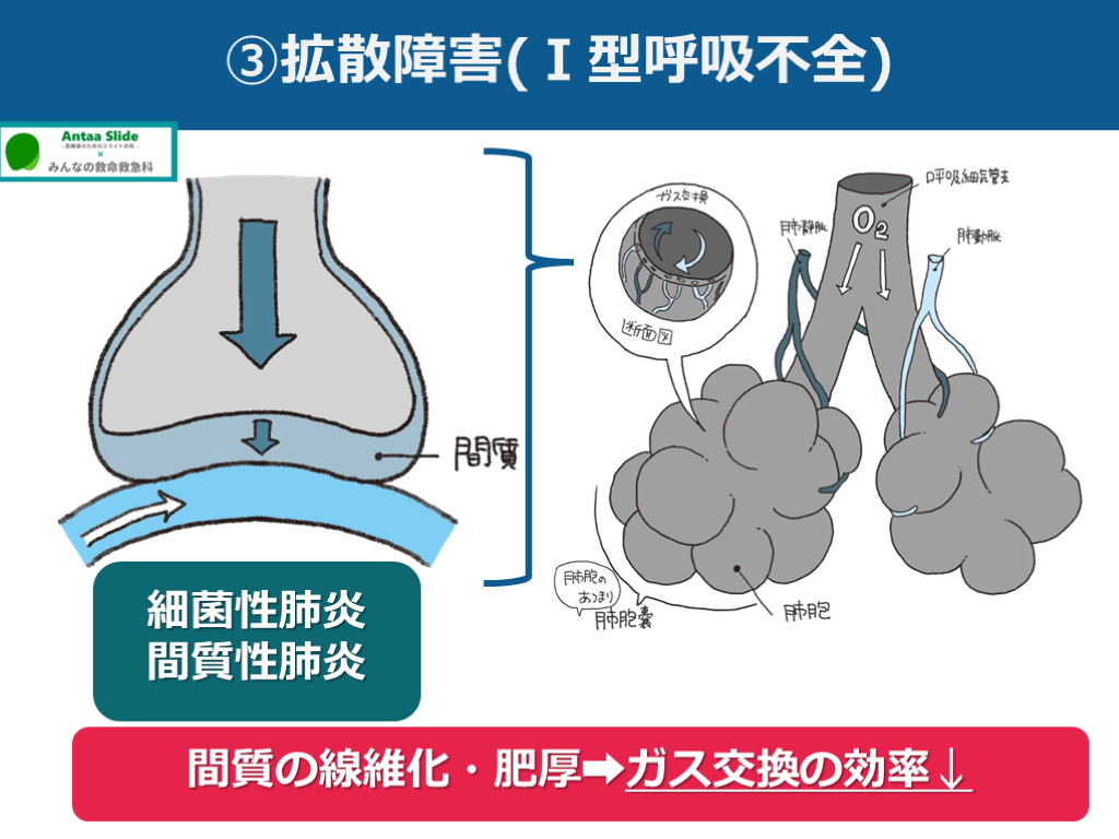 #24. ③拡散障害(Ⅰ型呼吸不全) 間質の線維化・肥厚➡ガス交換の効率↓ 細菌性肺炎