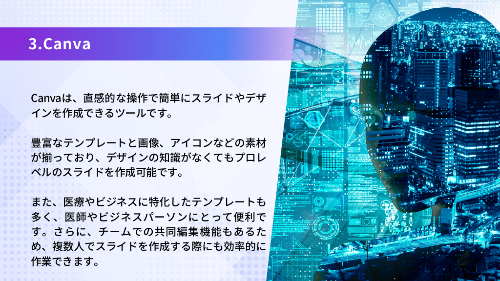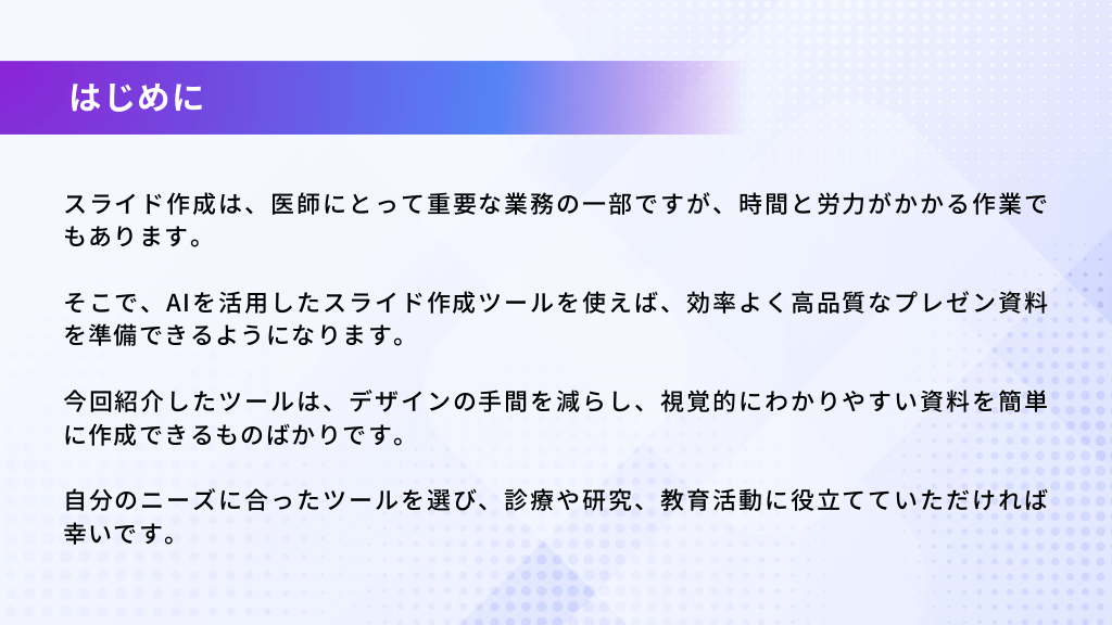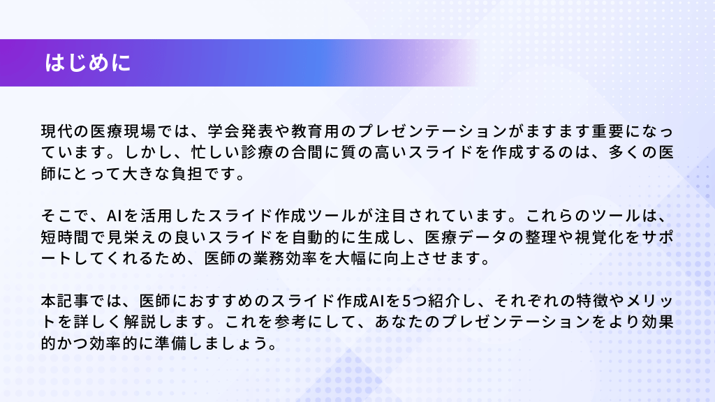 日々忙しい診療や研究の中で、質の高いスライドを作成する時間を確保するのは、容易ではありません。プレゼンテーションの準備にかける時間を少しでも短縮し、内容の質を向上させるために、AIツールの活用が非常に有効です。スライド作成AIは、医療現場に必要な正確さと視覚的な理解のしやすさを兼ね備えたスライドを短時間で作成できます。