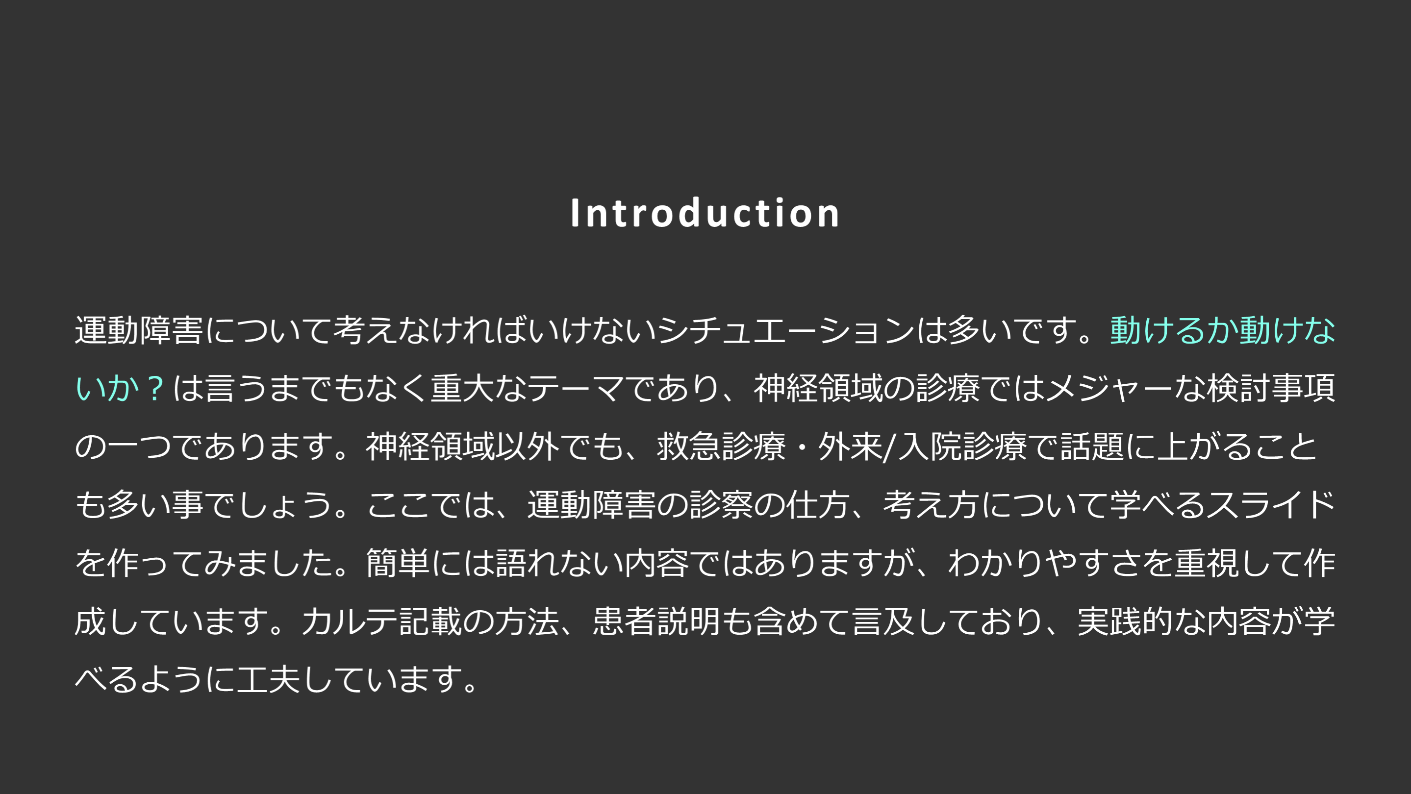 #2. Introduction 運動障害について考えなければいけないシチュエーションは多いです。動けるか動けないか?は言うまでもなく重大なテーマであり、神経領域の診療ではメジャーな検討事項の一つであります。神経領域以外でも、救急診療・外来/入院診療で話題に上がることも多い事でしょう。ここでは、運動障害の診察の仕方、考え方について学べるスライドを作ってみました。簡単には語れない内容ではありますが、わかりやすさを重視して作成しています。カルテ記載の方法、患者説明も含めて言及しており、実践的な内容が学べるように工夫しています。