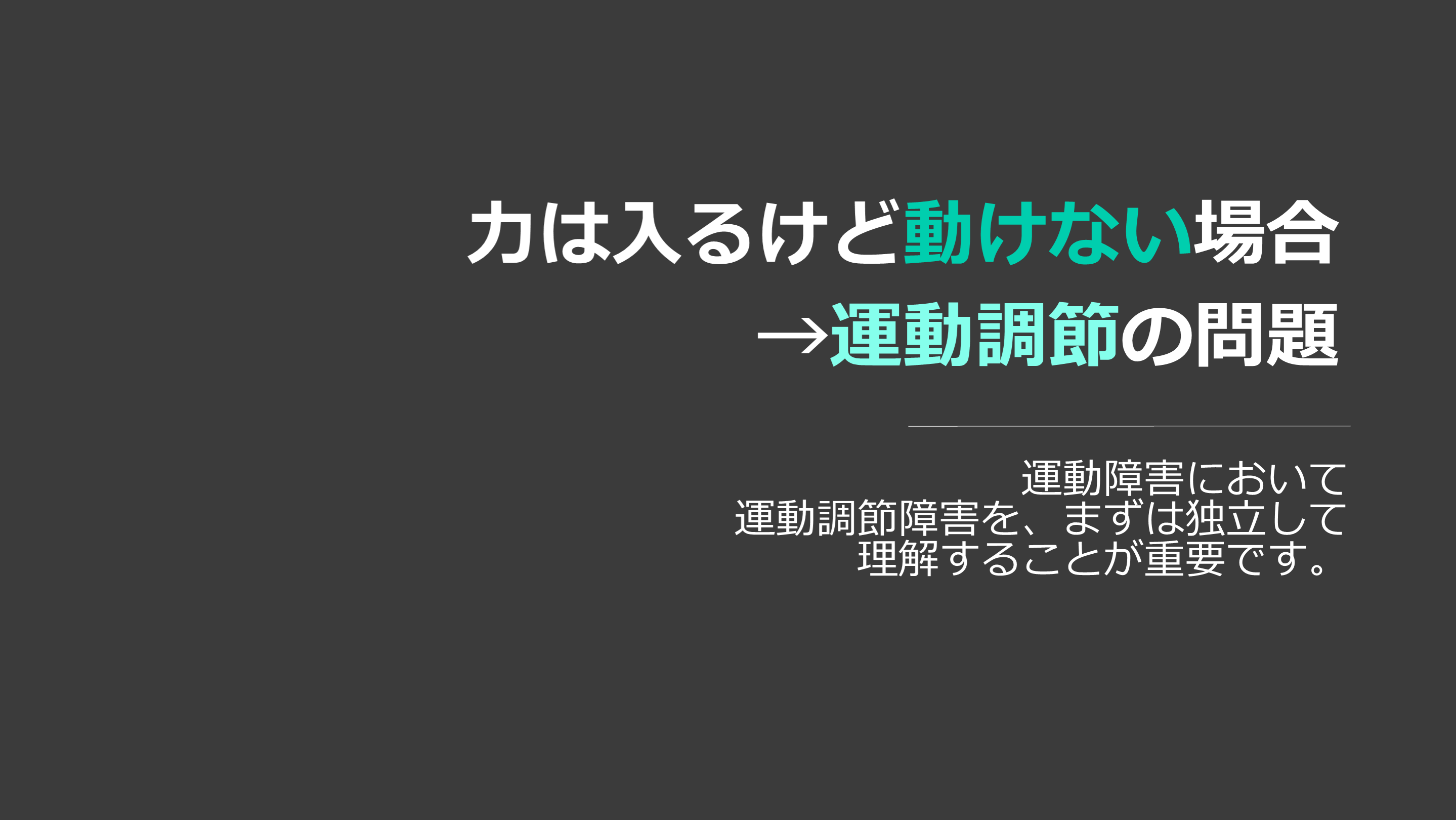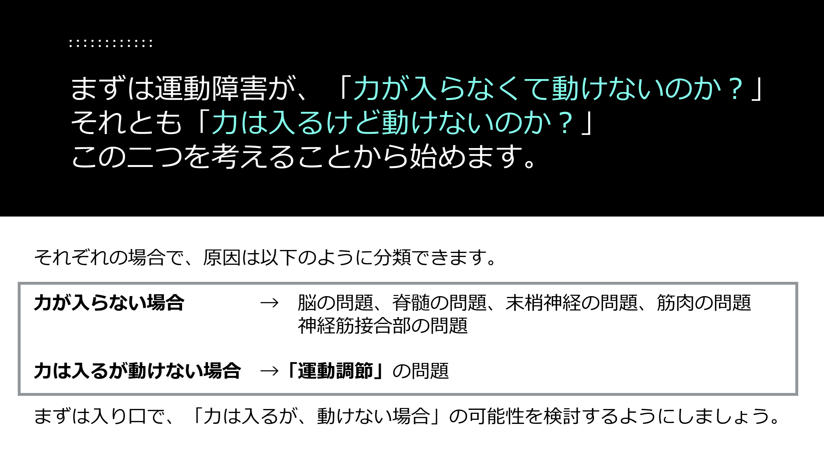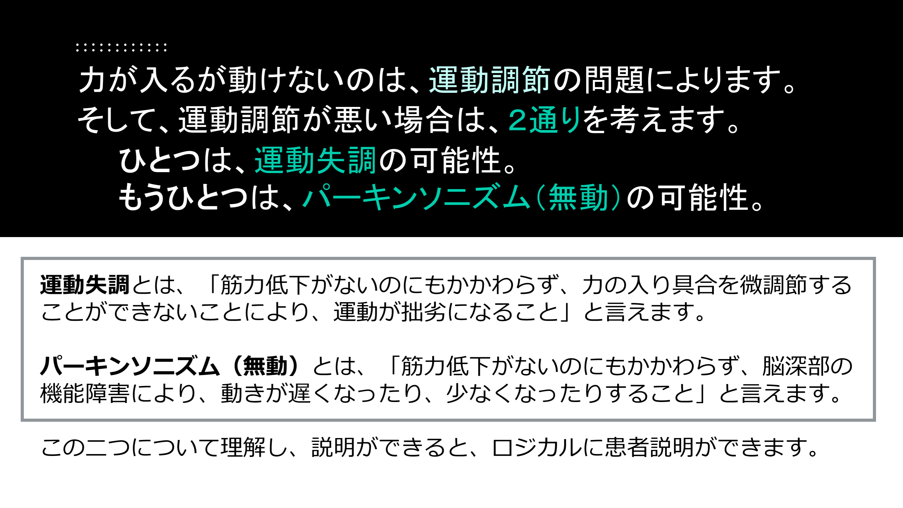 この二つについて理解し、説明ができると、ロジカルに患者説明ができます。 力が入るが動けないのは、運動調節の問題によります。