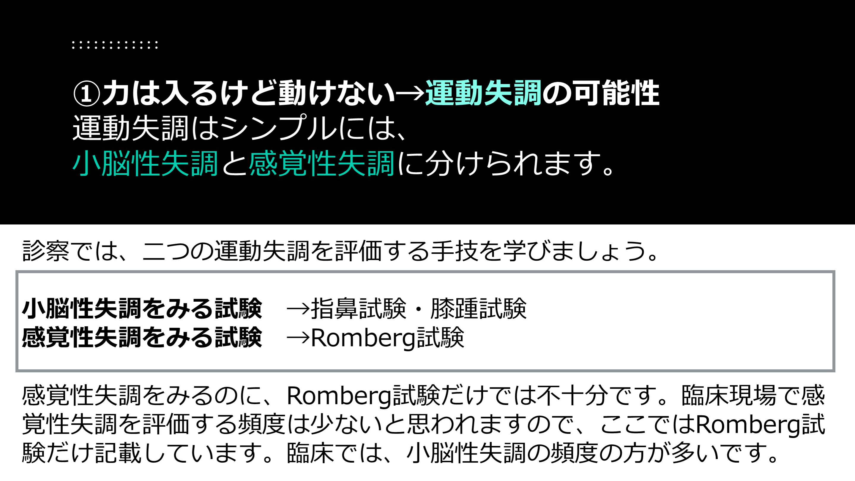 感覚性失調をみるのに、Romberg試験だけでは不十分です。臨床現場で感覚性失調を評価する頻度は少ないと思われますので、ここではRomberg試験だけ記載しています。臨床では、小脳性失調の頻度の方が多いです。 ①力は入るけど動けない→運動失調の可能性