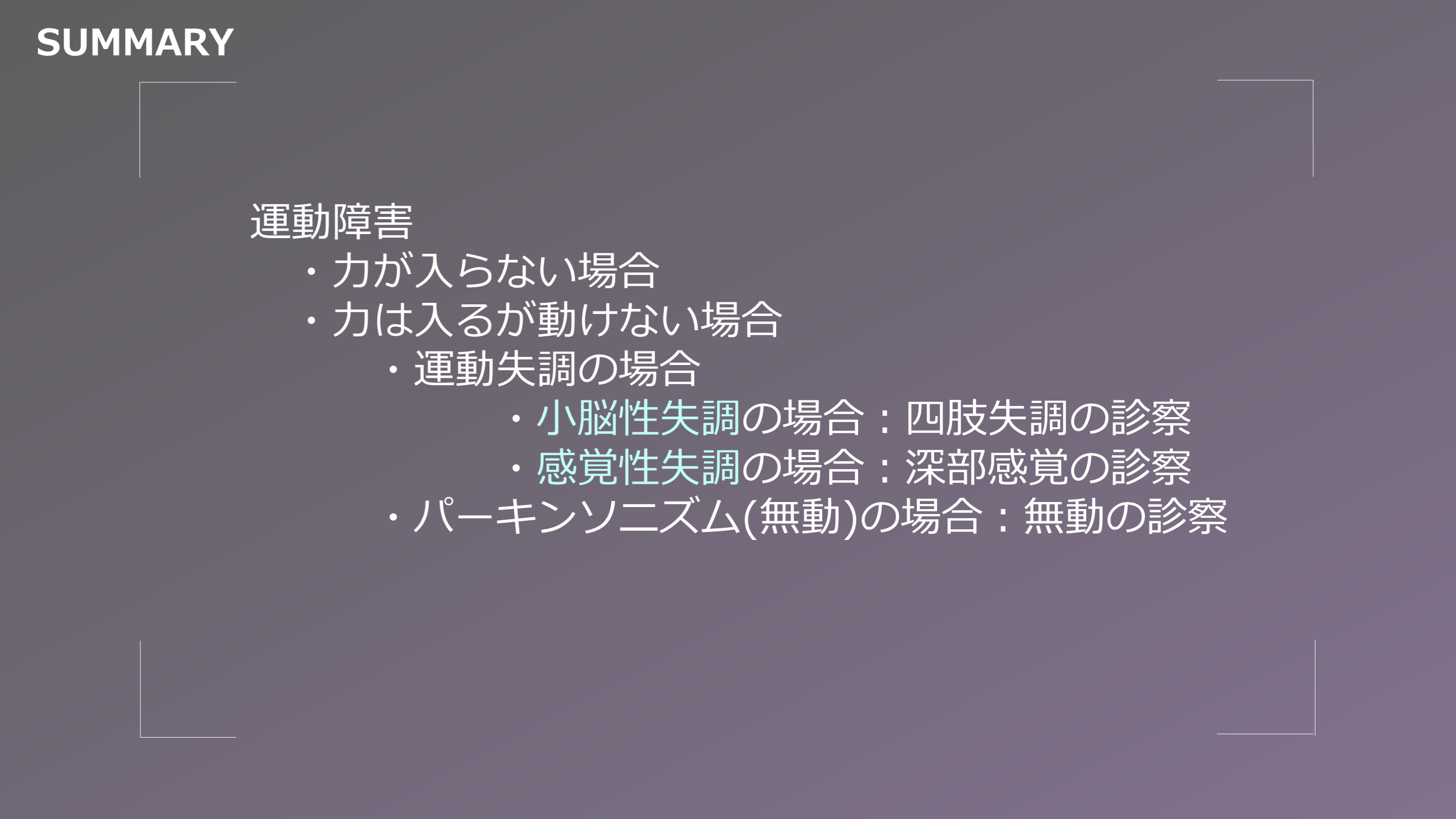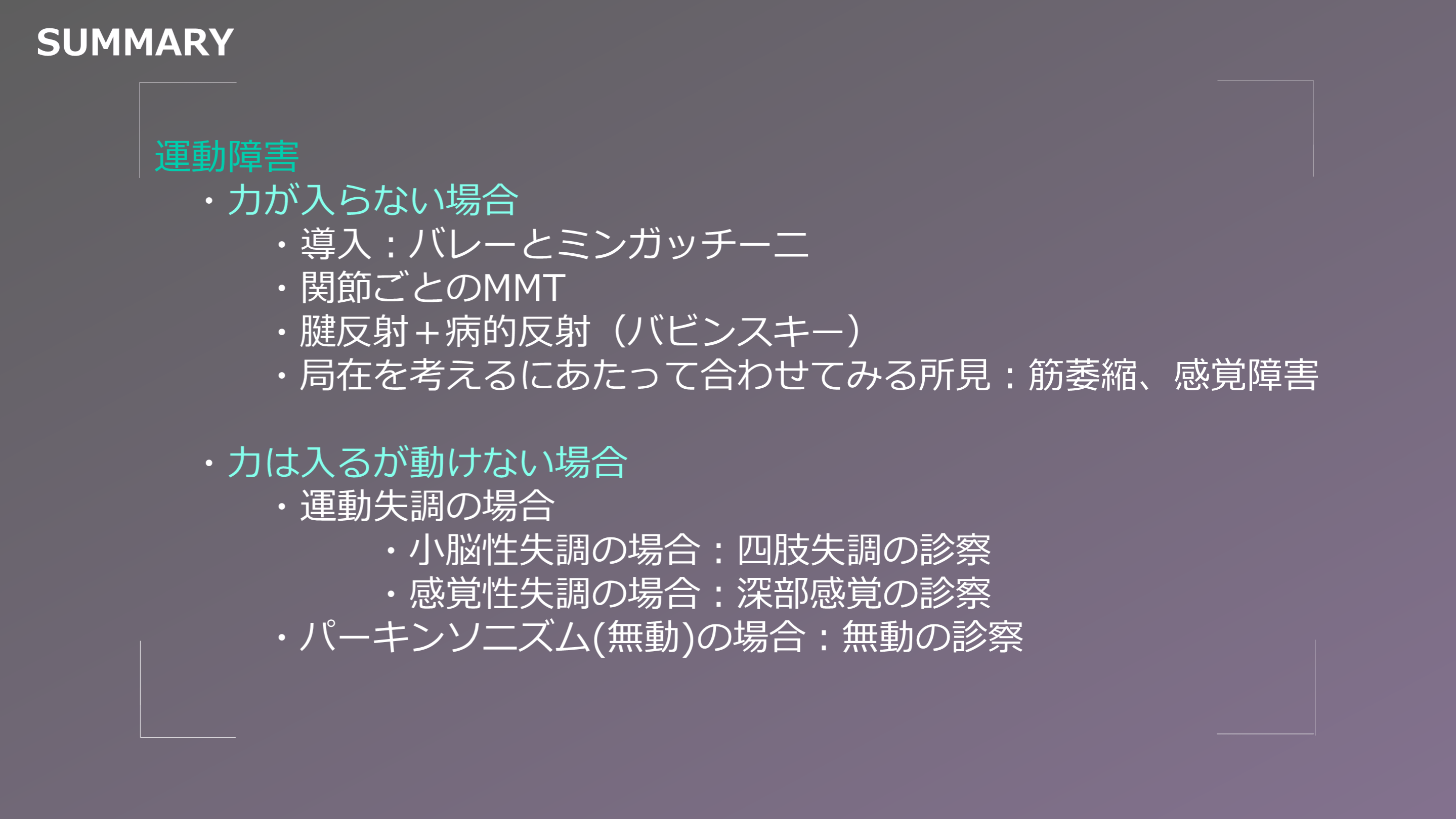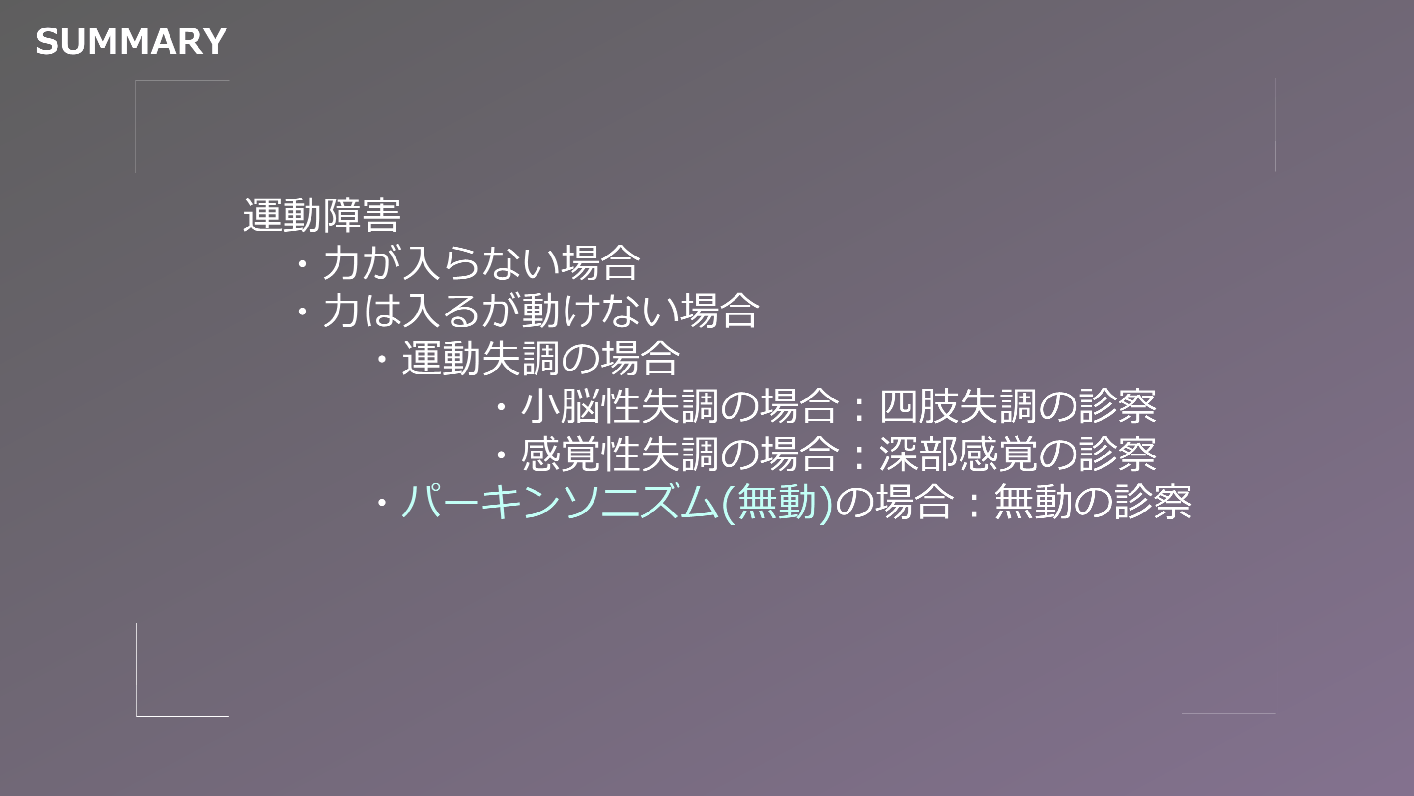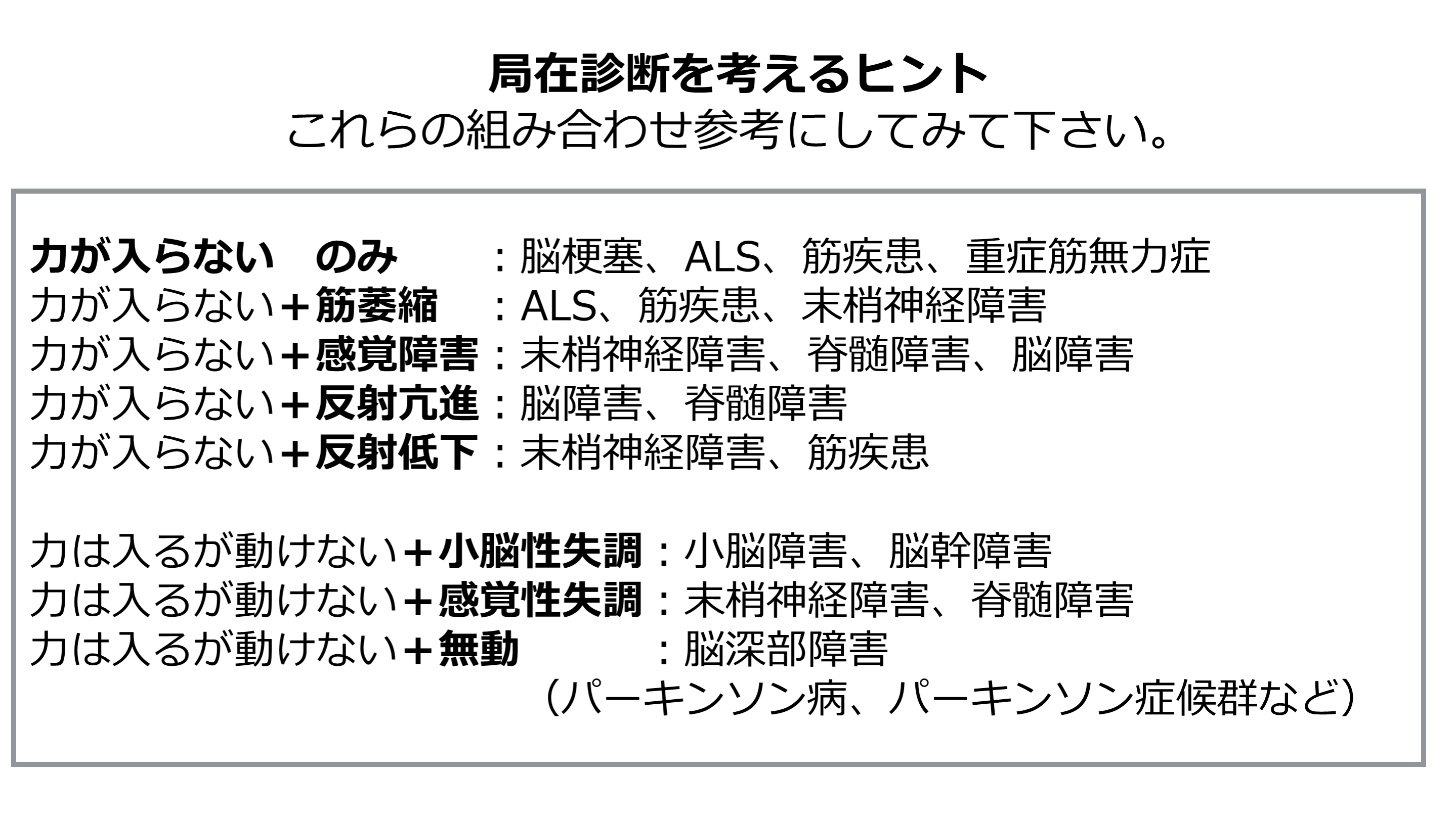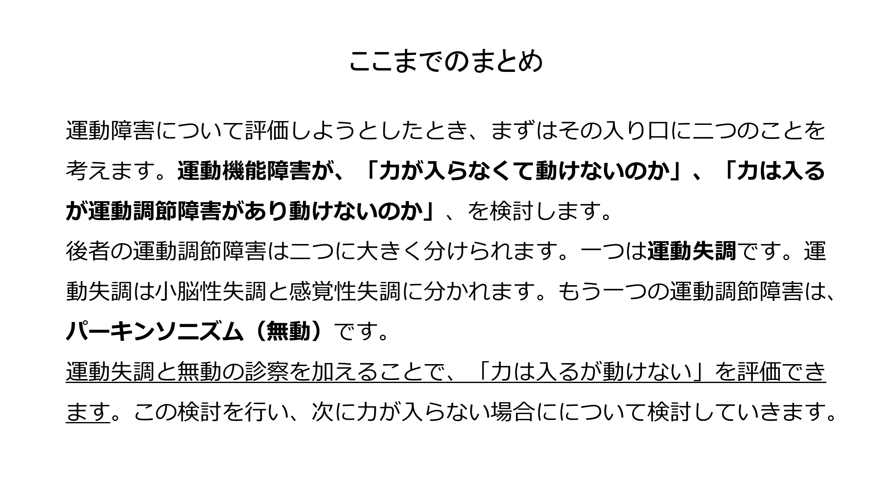 運動失調と無動の診察を加えることで、「力は入るが動けない」を評価できます。この検討を行い、次に力が入らない場合にについて検討していきます。 ここまでのまとめ