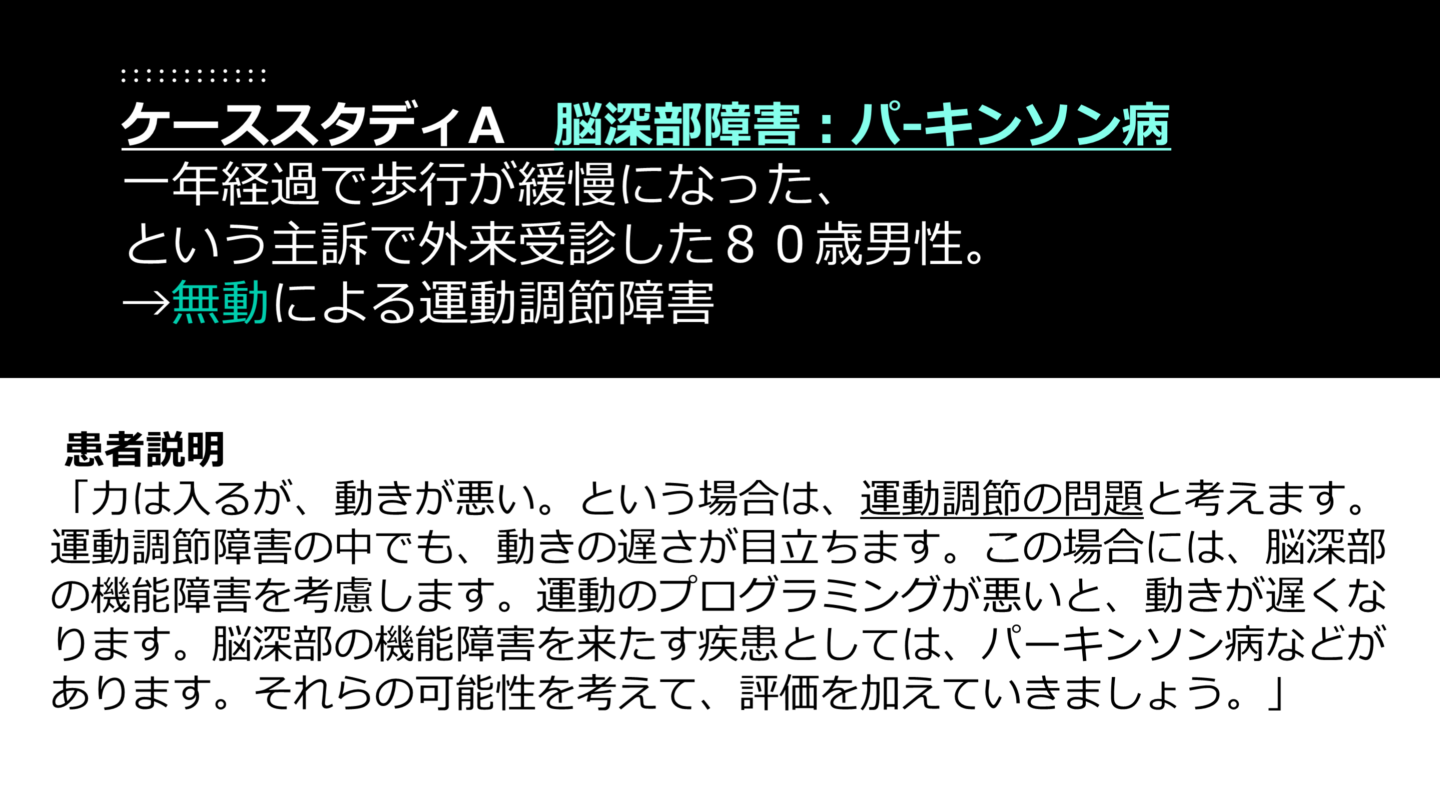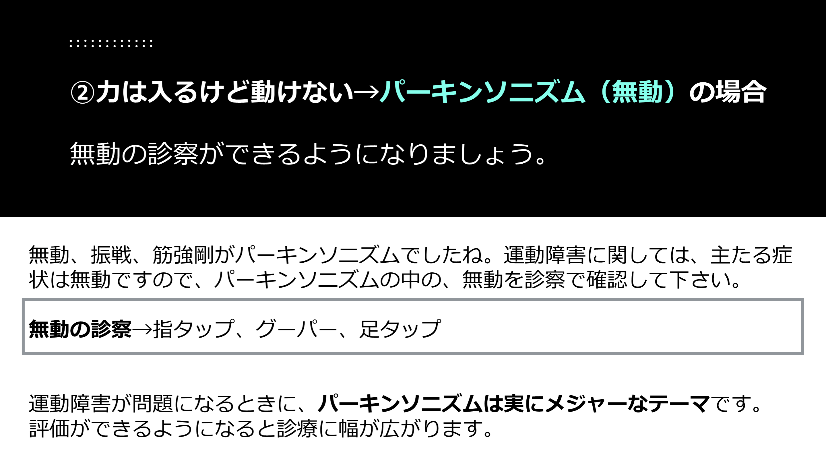 評価ができるようになると診療に幅が広がります。 ②力は入るけど動けない→パーキンソニズム(無動)の場合