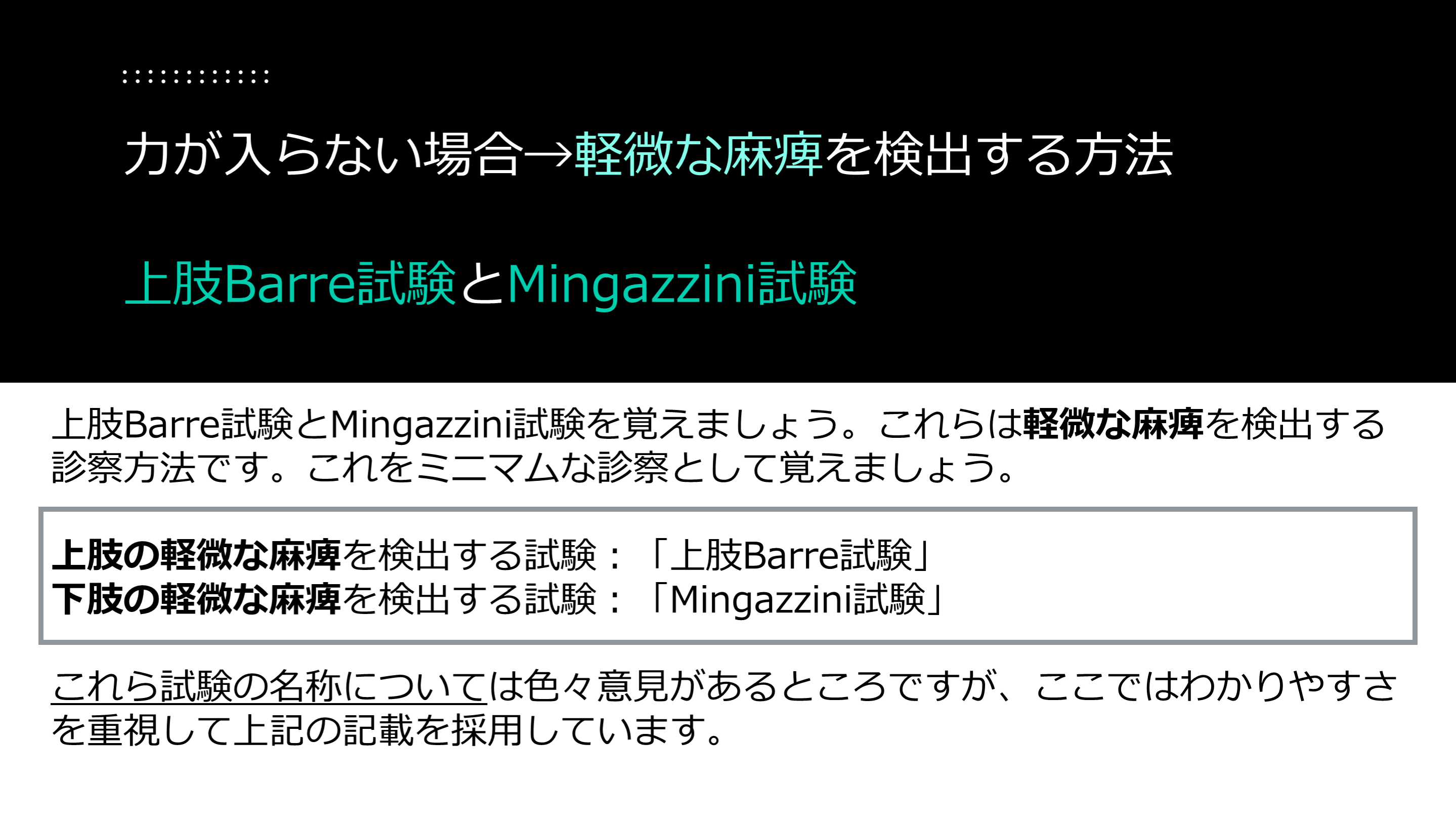#15. 上肢Barre試験とMingazzini試験を覚えましょう。これらは軽微な麻痺を検出する診察方法です。これをミニマムな診察として覚えましょう。