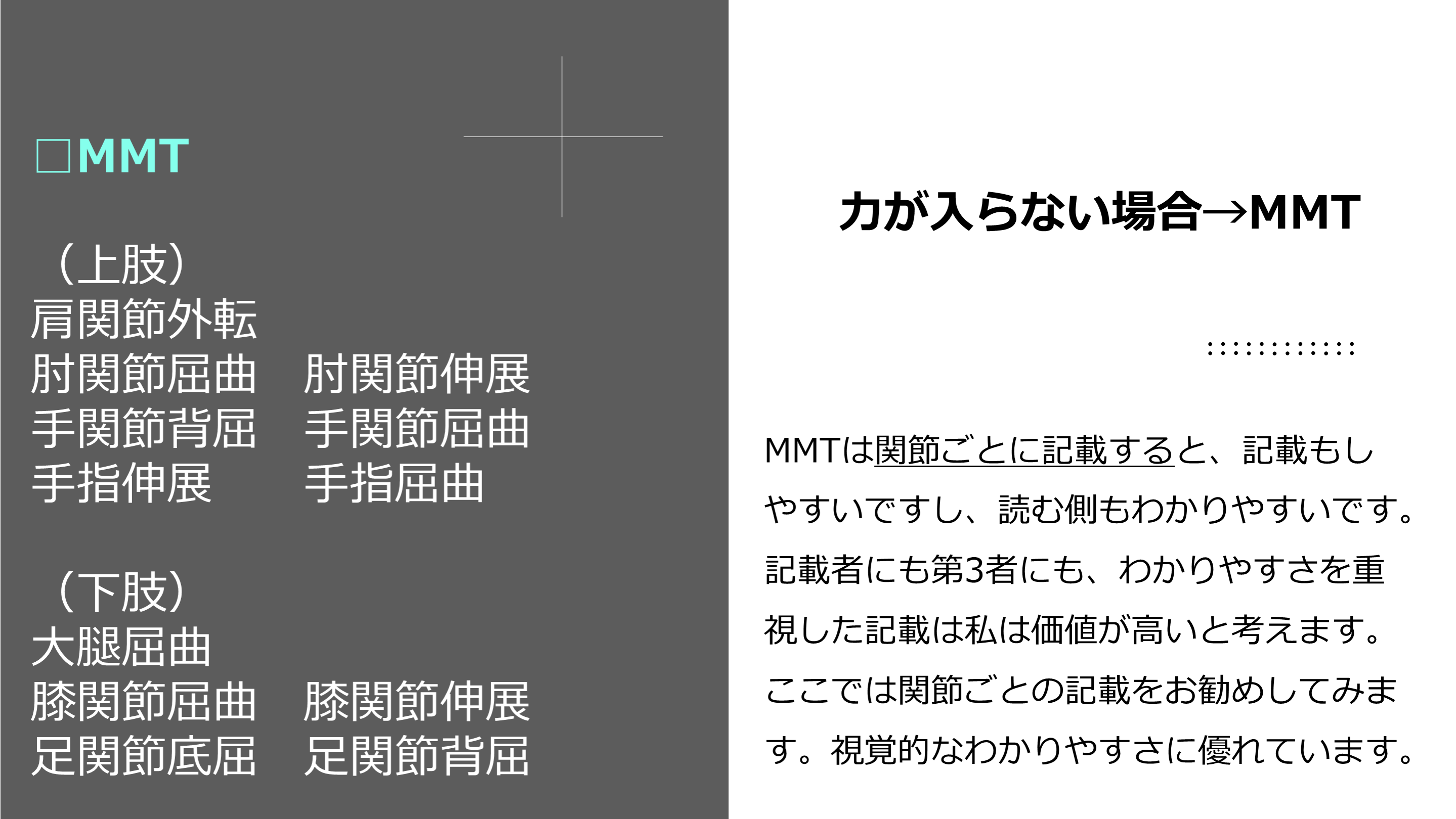 #17. 力が入らない場合→MMT MMTは関節ごとに記載すると、記載もしやすいですし、読む側もわかりやすいです。記載者にも第3者にも、わかりやすさを重視した記載は私は価値が高いと考えます。ここでは関節ごとの記載をお勧めしてみます。視覚的なわかりやすさに優れています。 □MMT