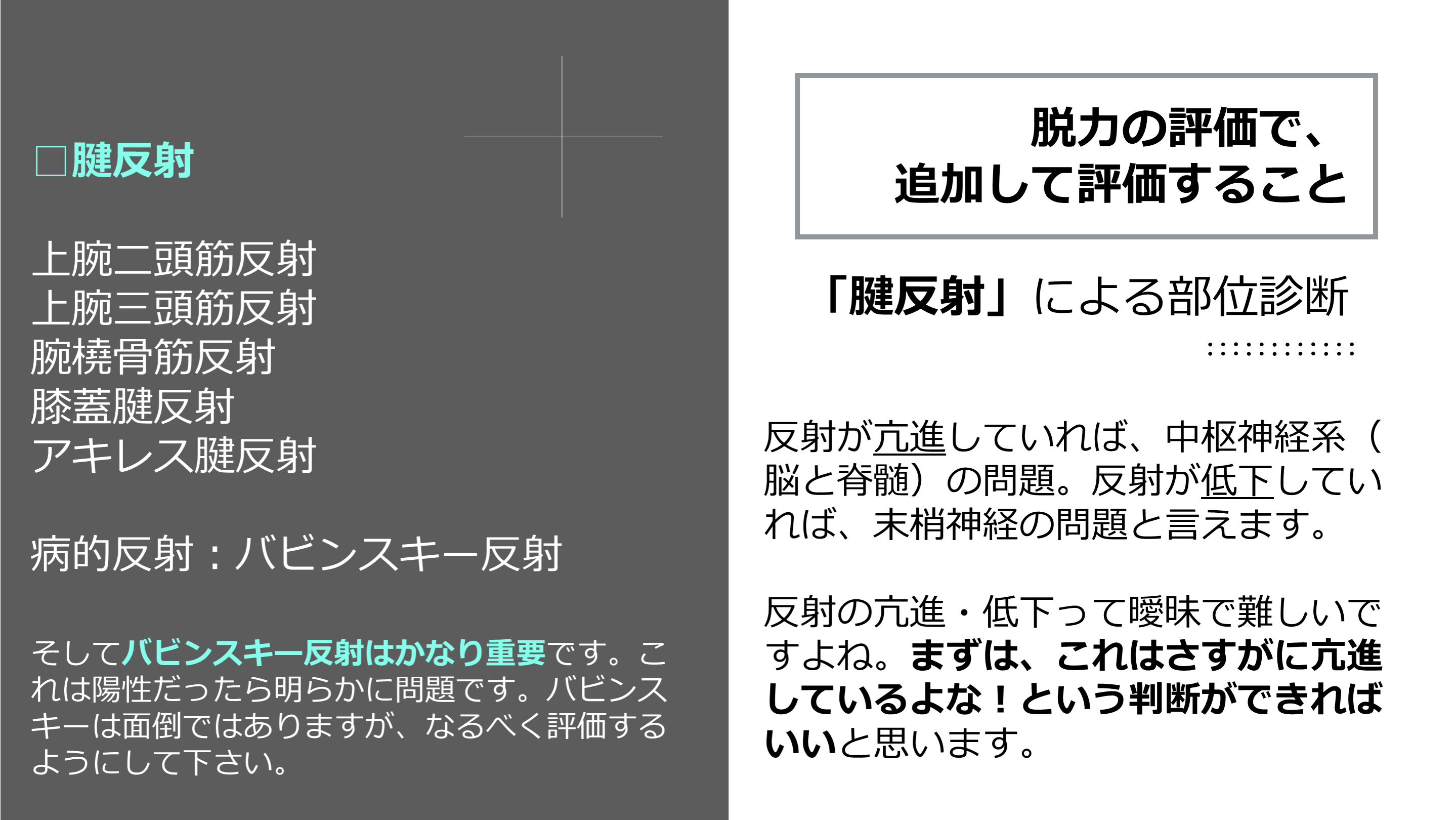 そしてバビンスキー反射はかなり重要です。これは陽性だったら明らかに問題です。バビンスキーは面倒ではありますが、なるべく評価するようにして下さい。
