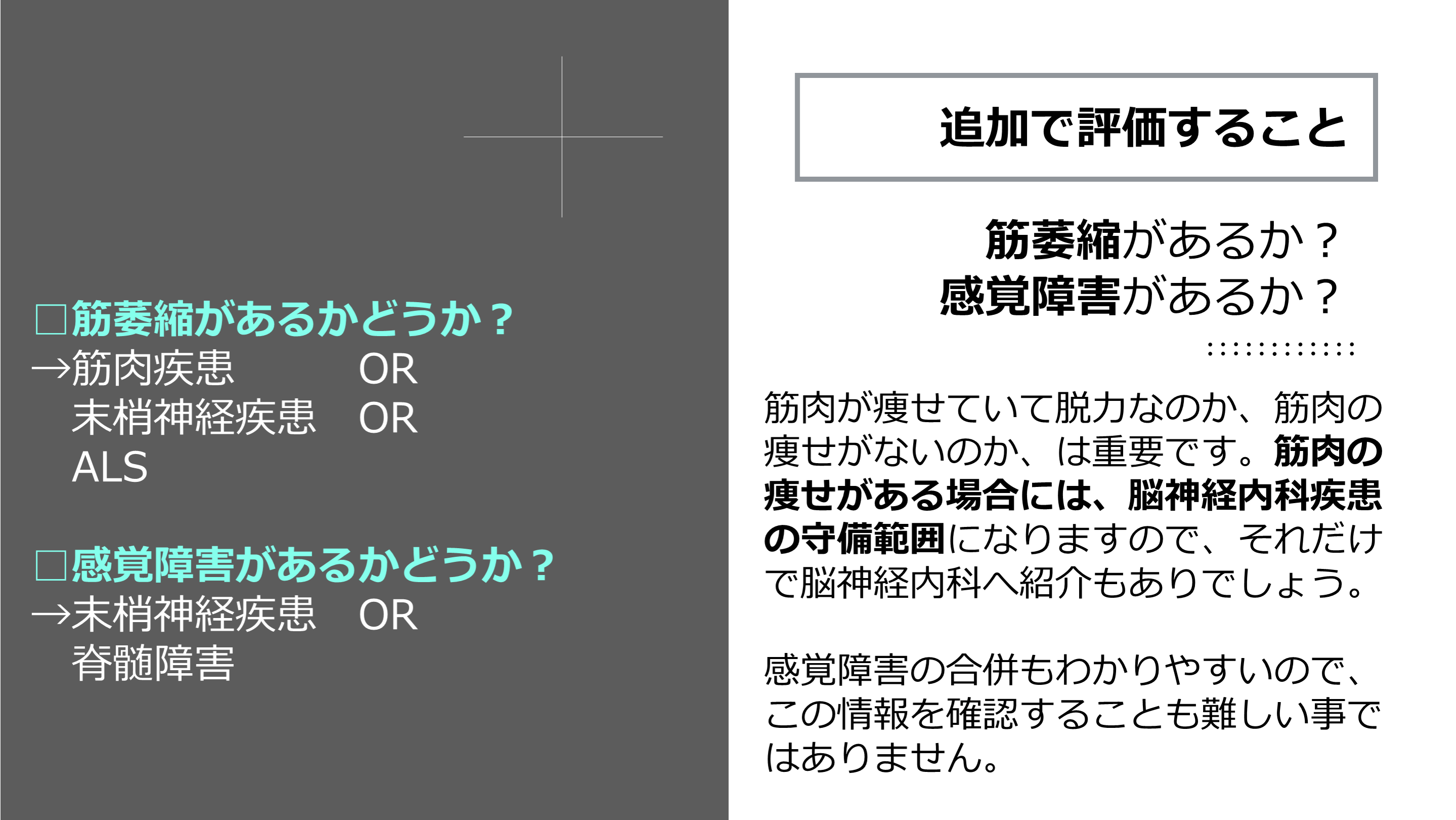 感覚障害があるか? 筋肉が痩せていて脱力なのか、筋肉の痩せがないのか、は重要です。筋肉の痩せがある場合には、脳神経内科疾患の守備範囲になりますので、それだけで脳神経内科へ紹介もありでしょう。
