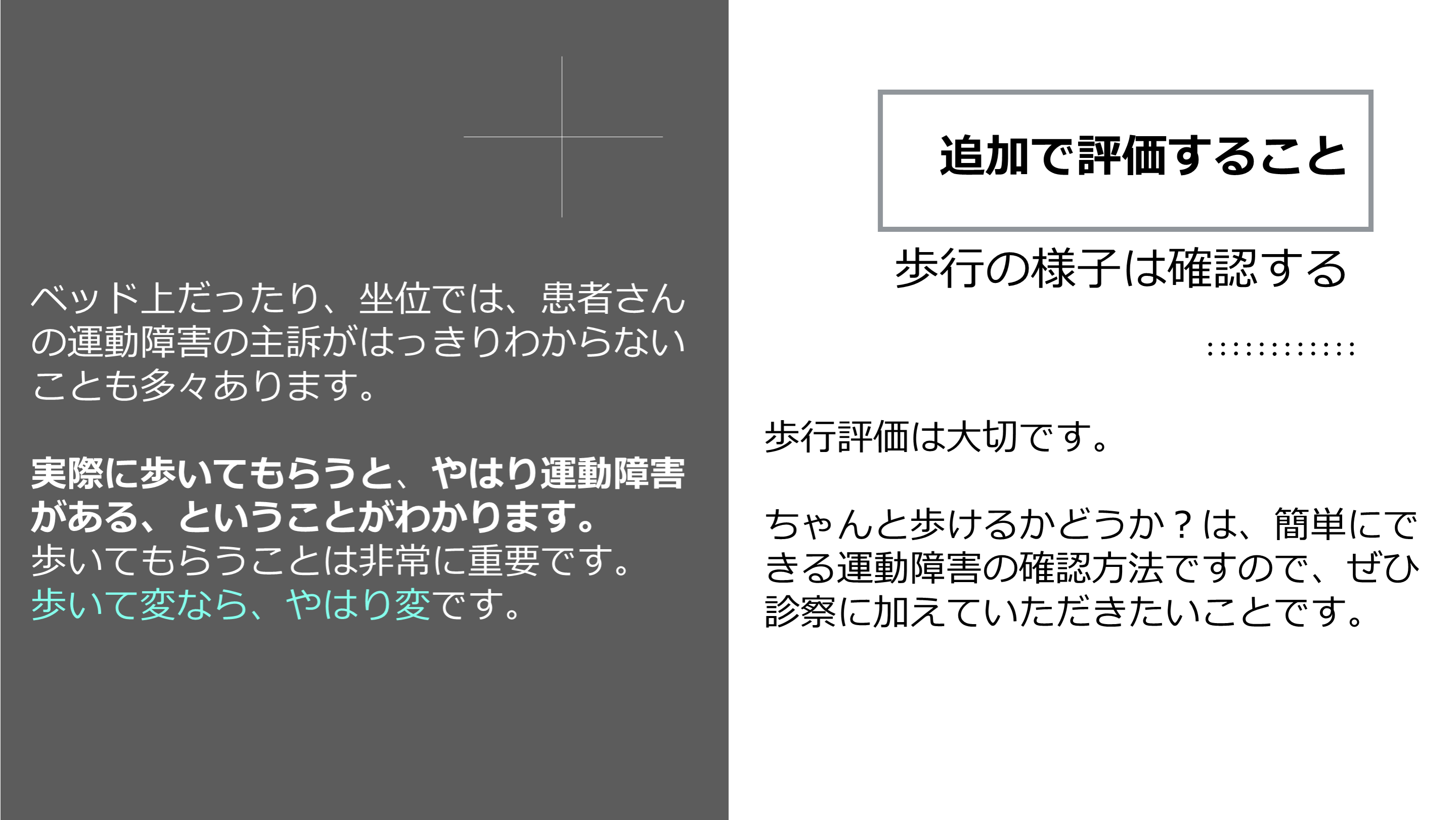 ちゃんと歩けるかどうか?は、簡単にできる運動障害の確認方法ですので、ぜひ診察に加えていただきたいことです。