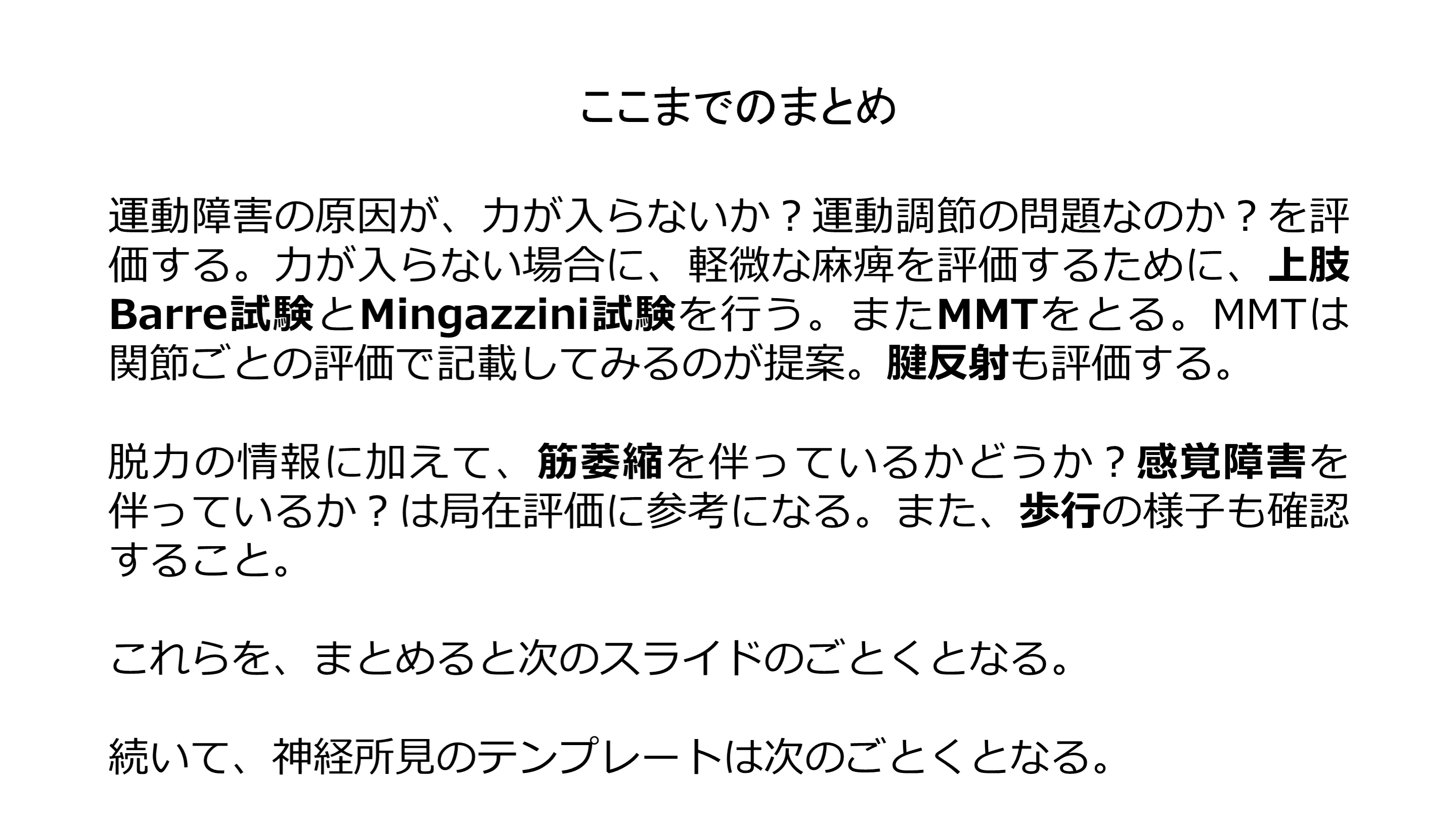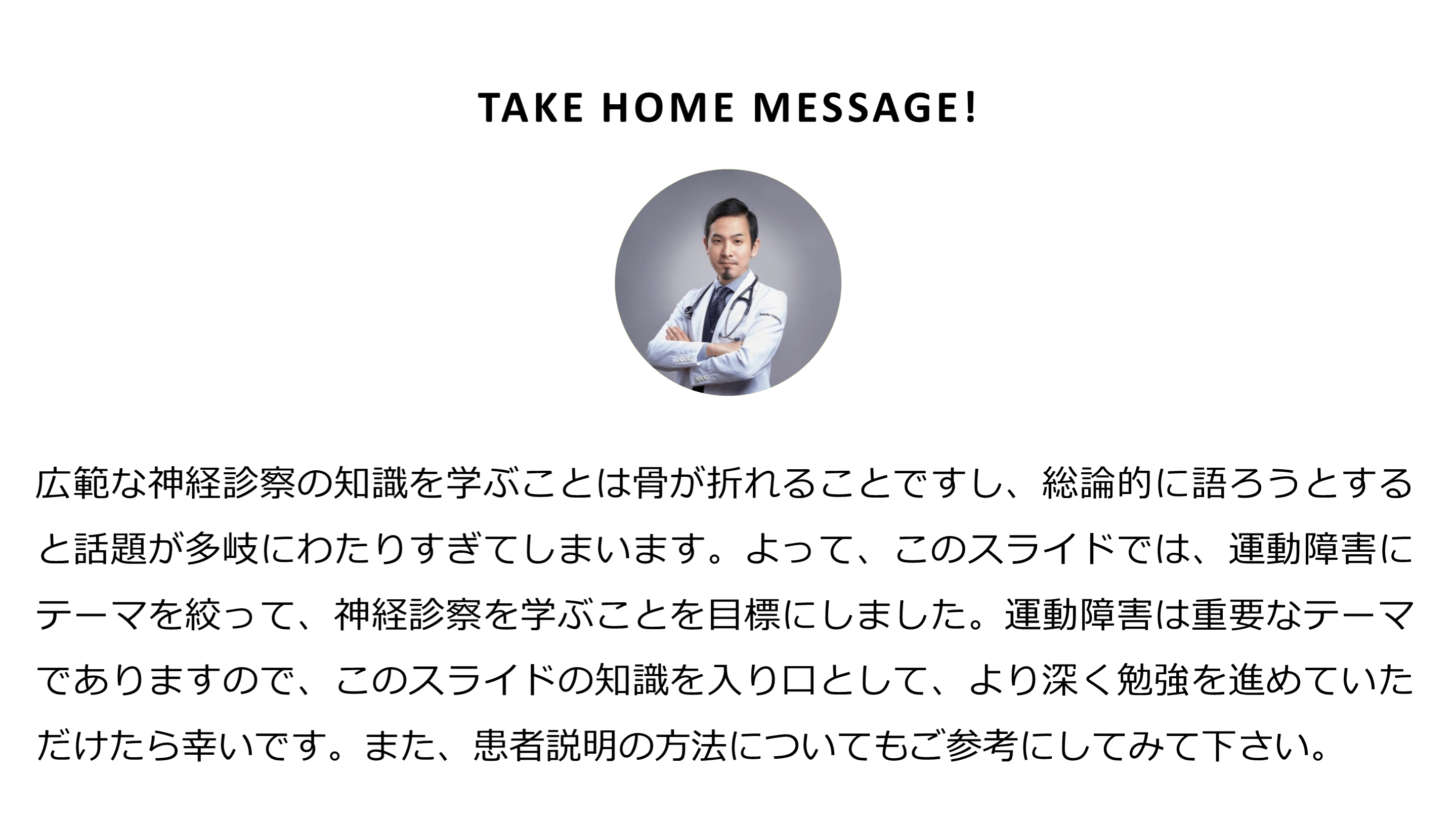 #53. 広範な神経診察の知識を学ぶことは骨が折れることですし、総論的に語ろうとすると話題が多岐にわたりすぎてしまいます。よって、このスライドでは、運動障害にテーマを絞って、神経診察を学ぶことを目標にしました。運動障害は重要なテーマでありますので、このスライドの知識を入り口として、より深く勉強を進めていただけたら幸いです。また、患者説明の方法についてもご参考にしてみて下さい。 TAKE HOME MESSAGE!