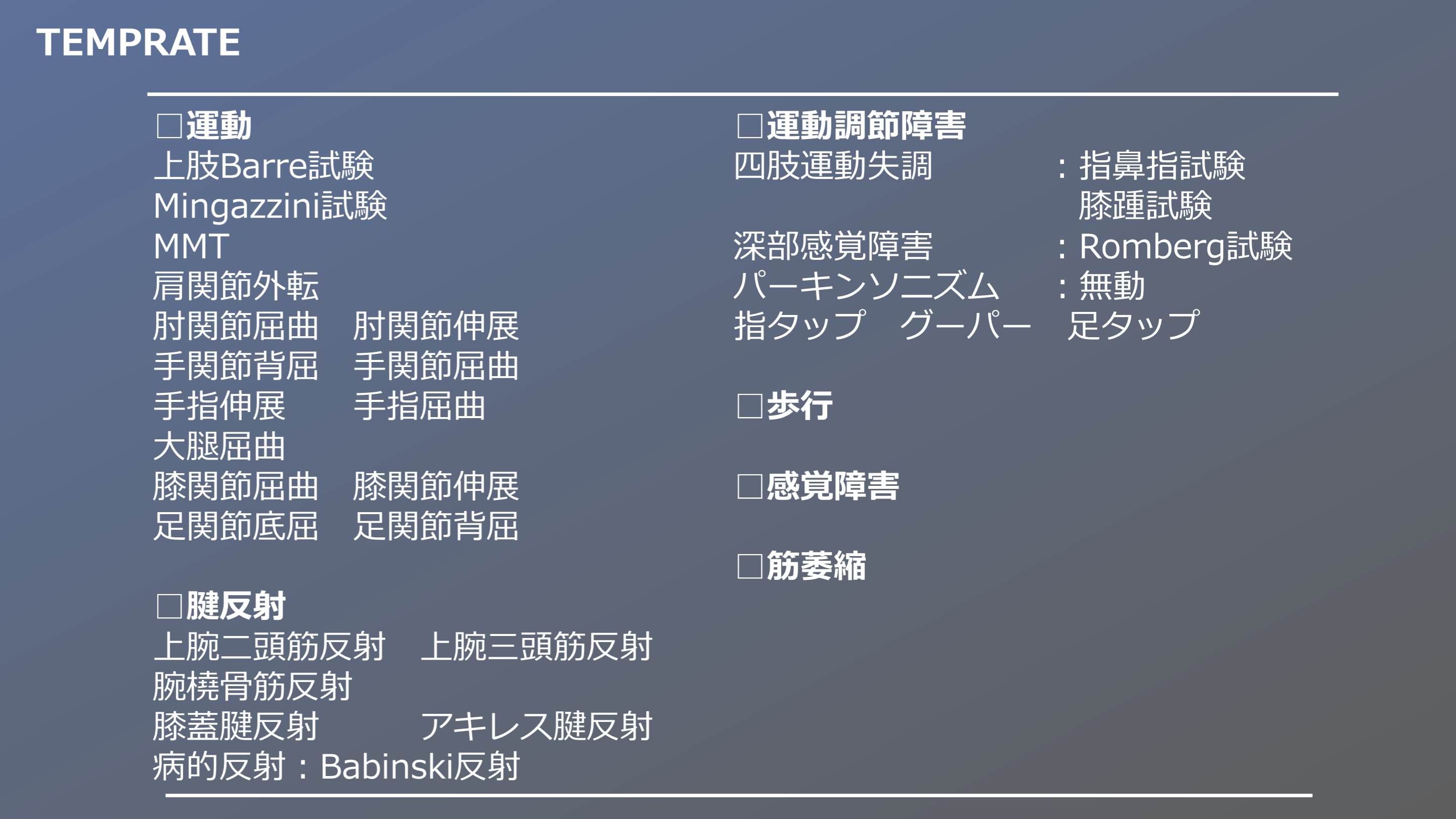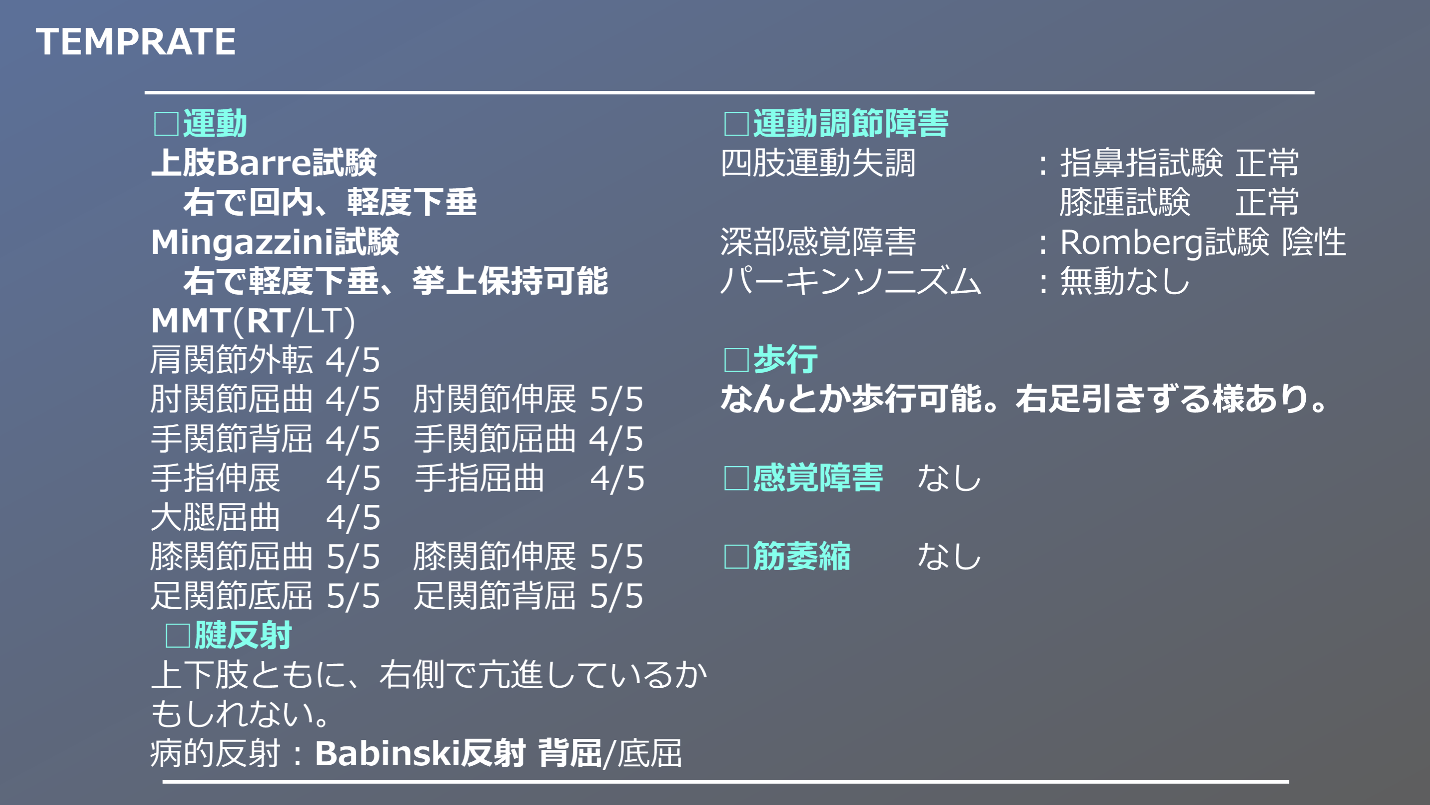 □筋萎縮 上下肢軽度筋萎縮ありそう。 TEMPRATE