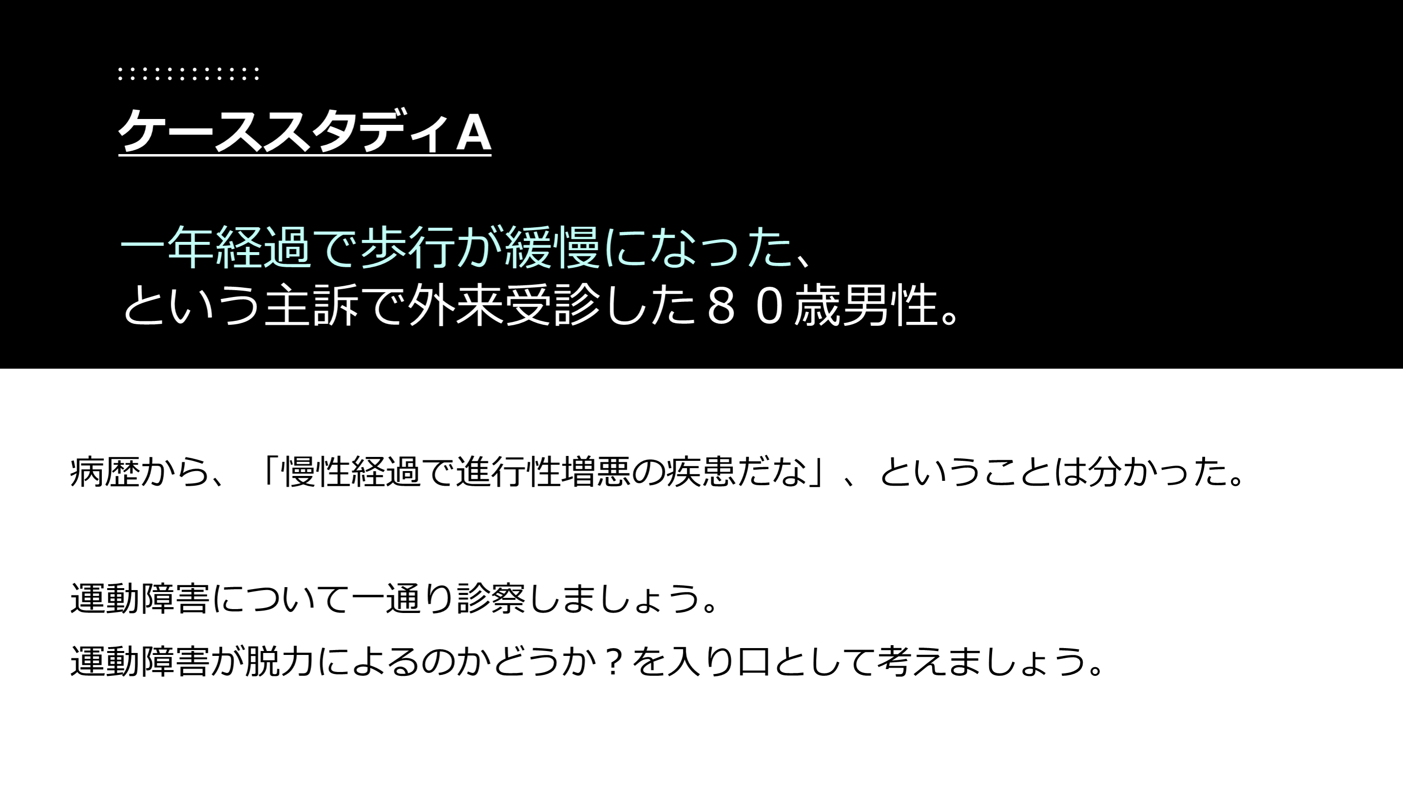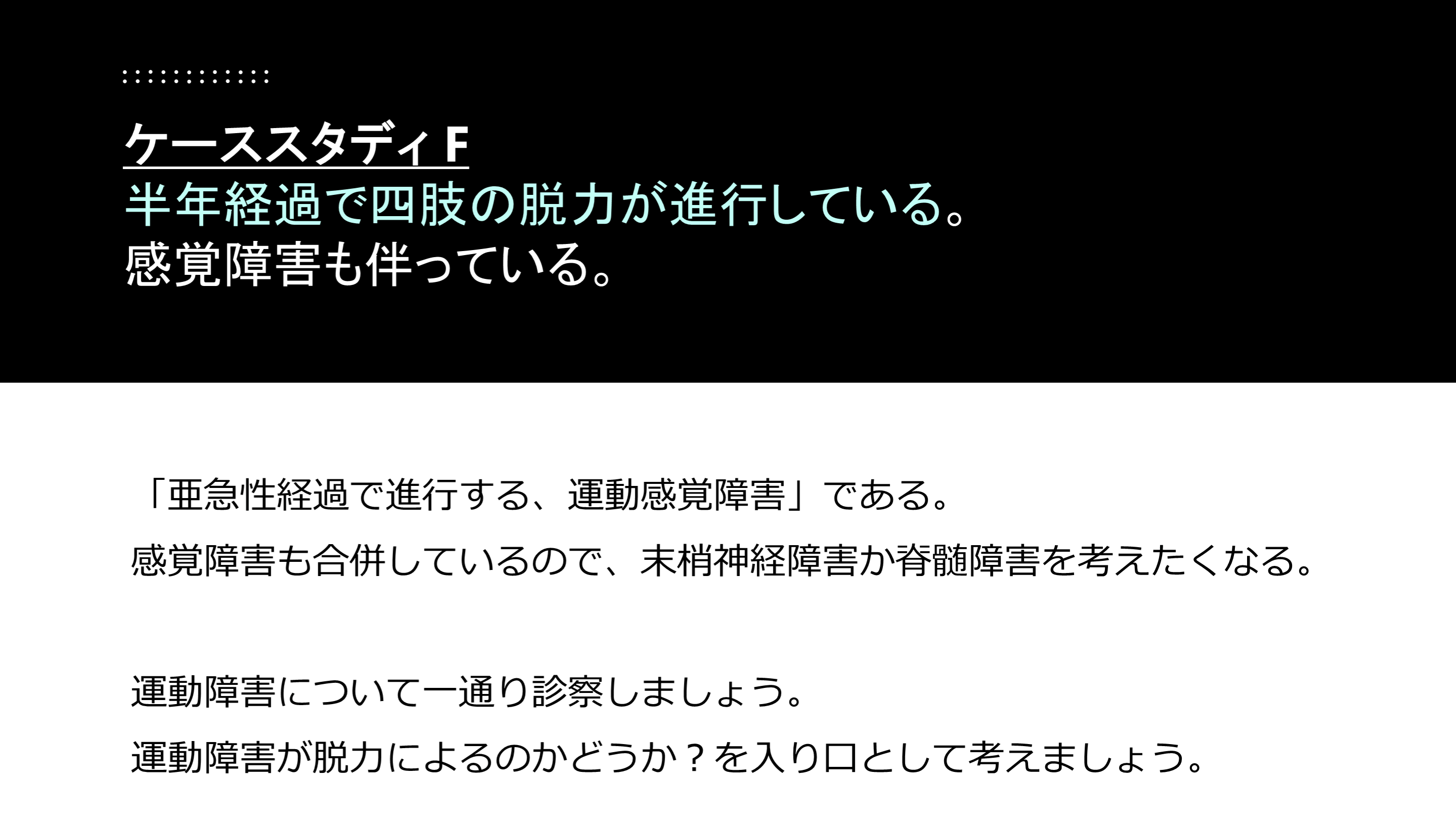 運動障害が脱力によるのかどうか?を入り口として考えましょう。 ケーススタディ F