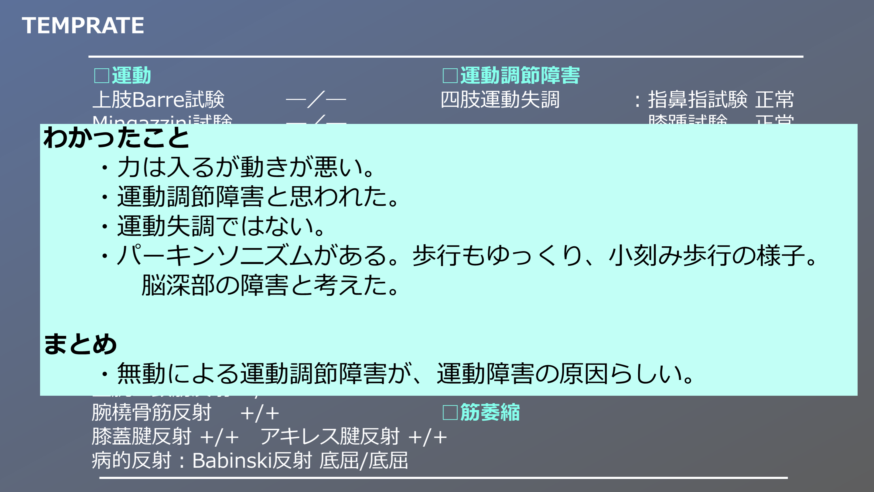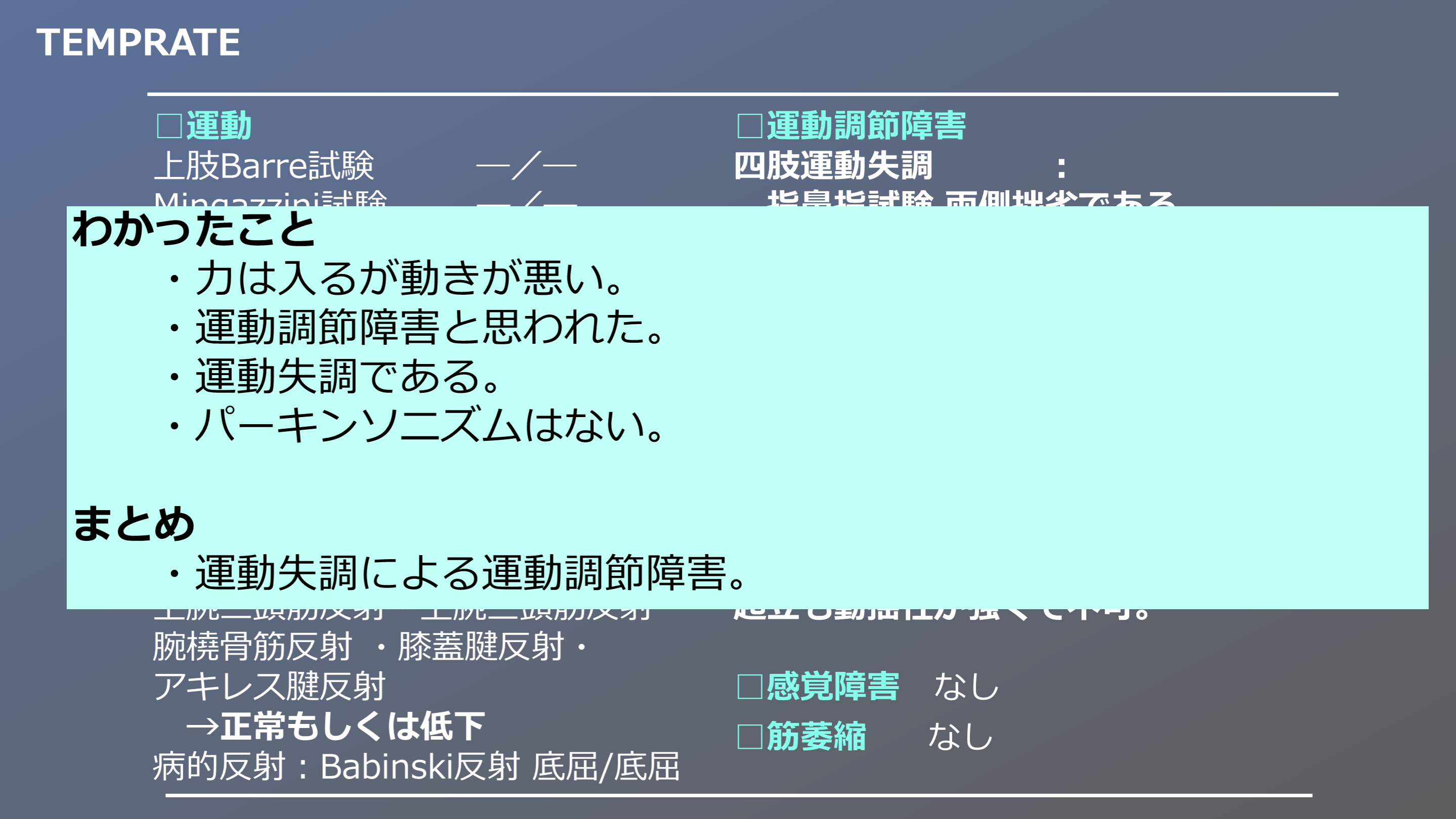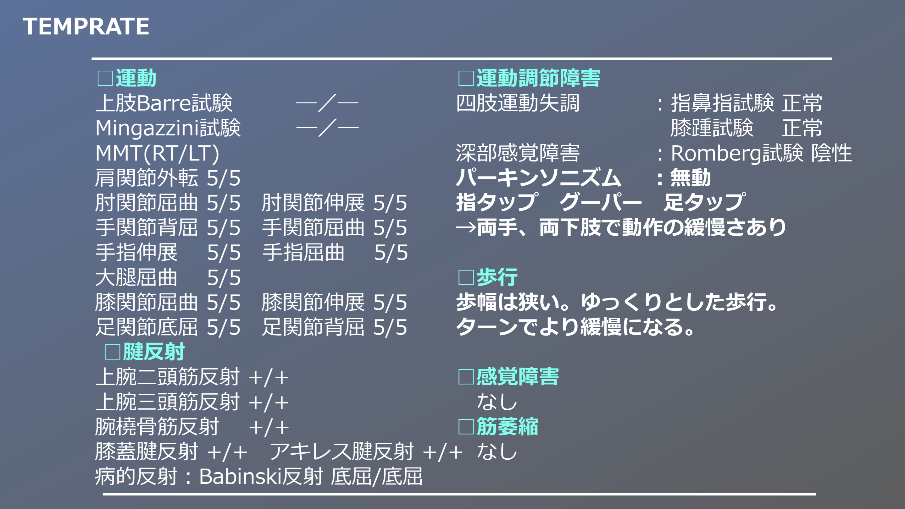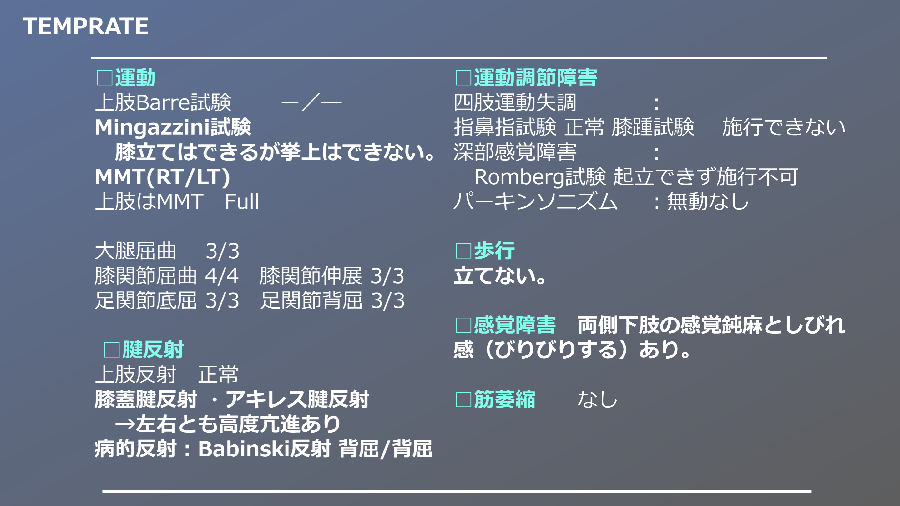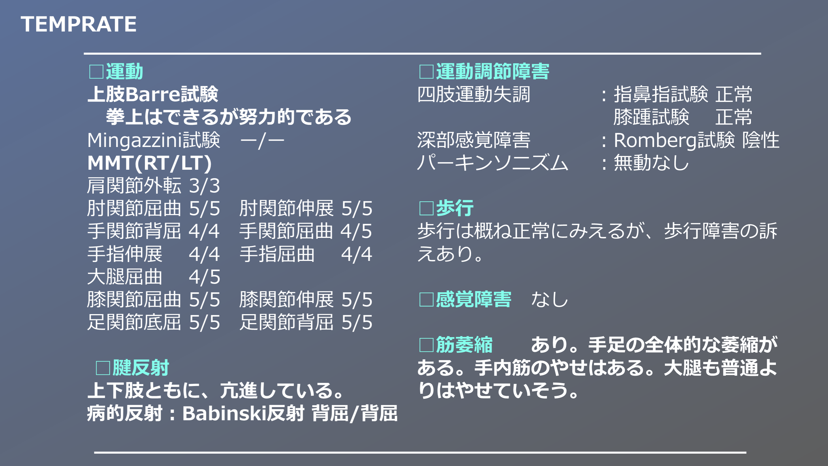 □筋萎縮 あり。手足の全体的な萎縮がある。手内筋のやせはある。大腿も普通よりはやせていそう。 TEMPRATE わかったこと